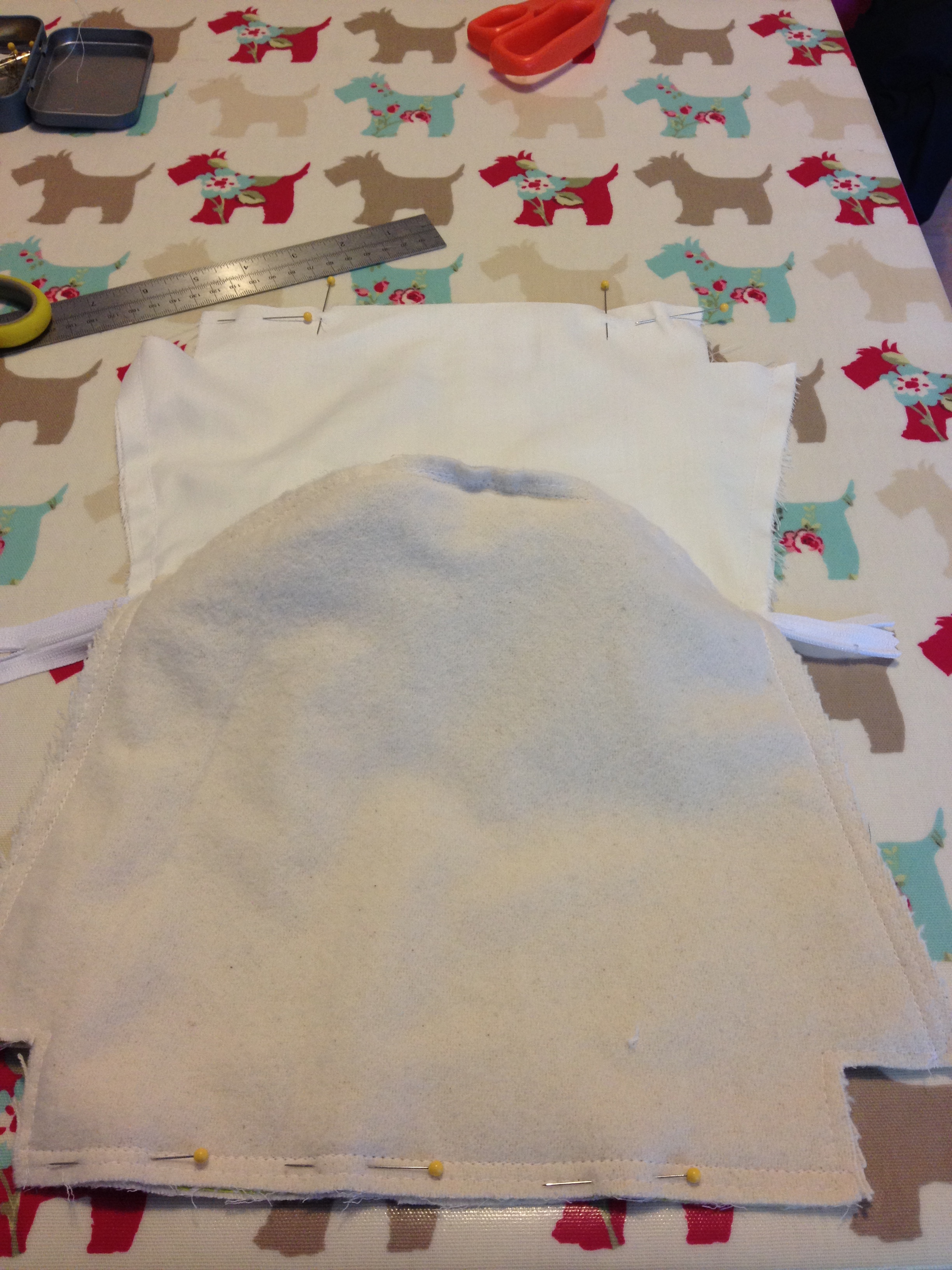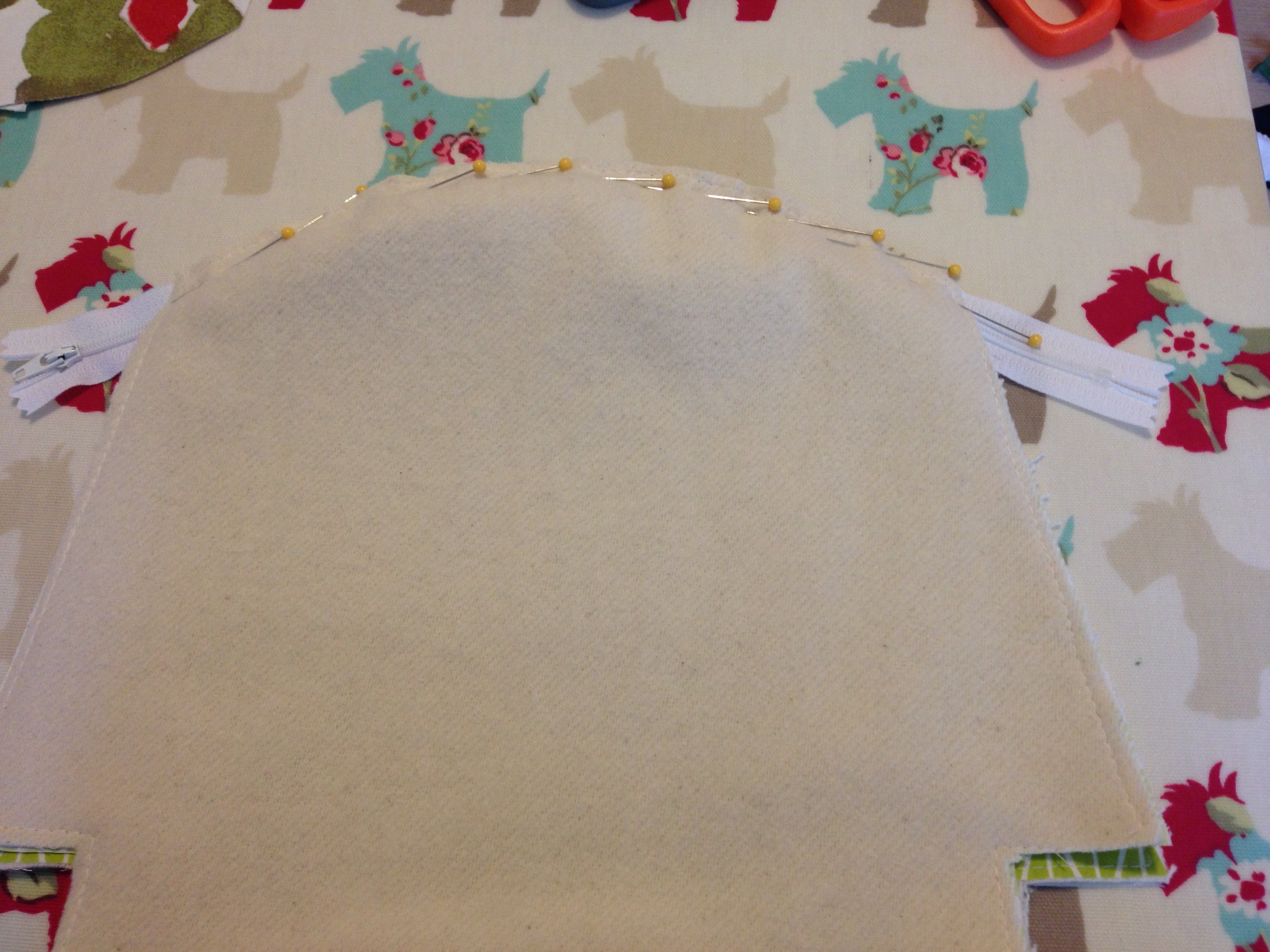 Just using one of the main pieces of the fabric, place the zip facing down as per the image and put one pin to hold it in place (the zip should be hanging off the side of the makeup bag just like the picture):