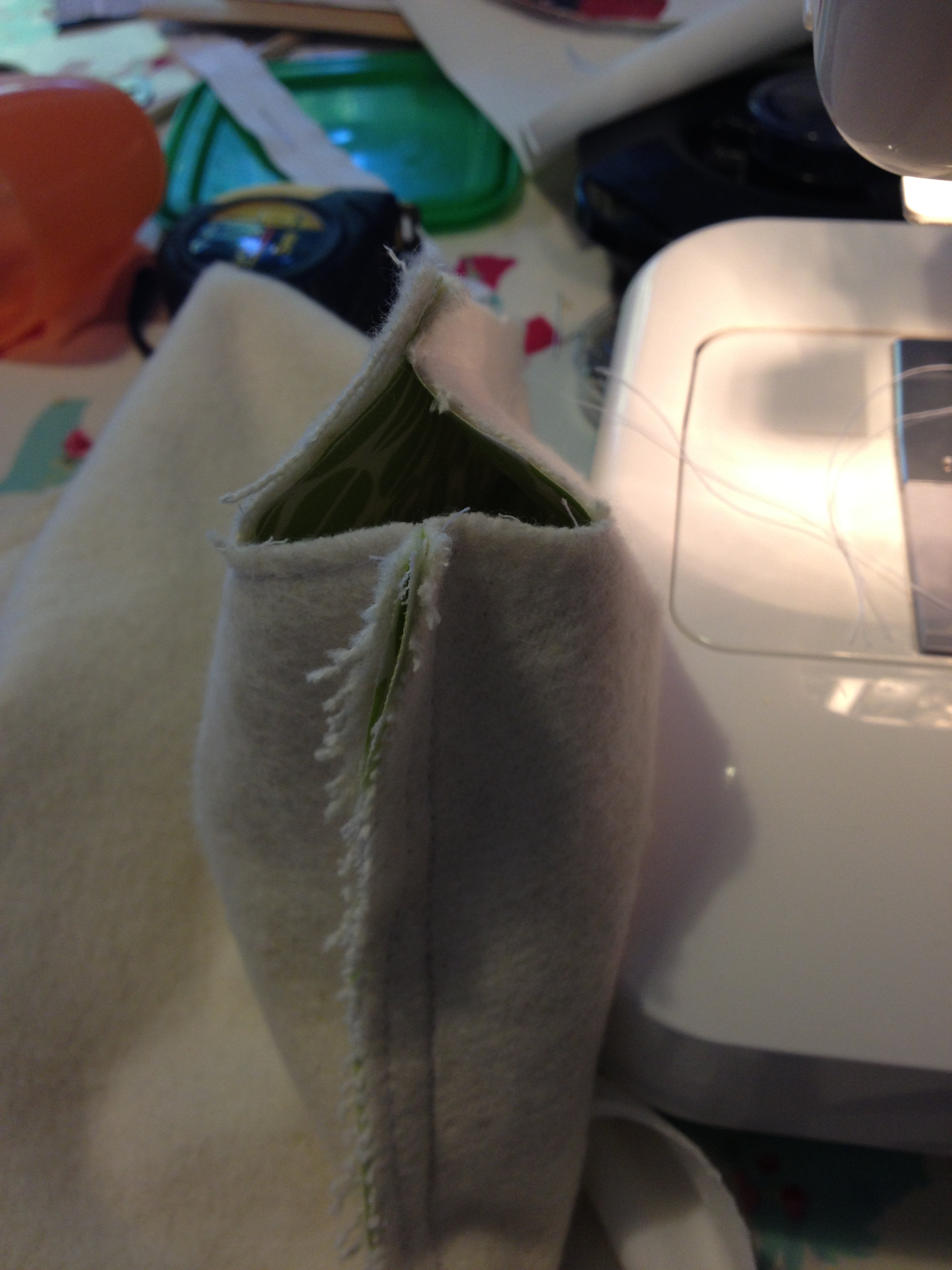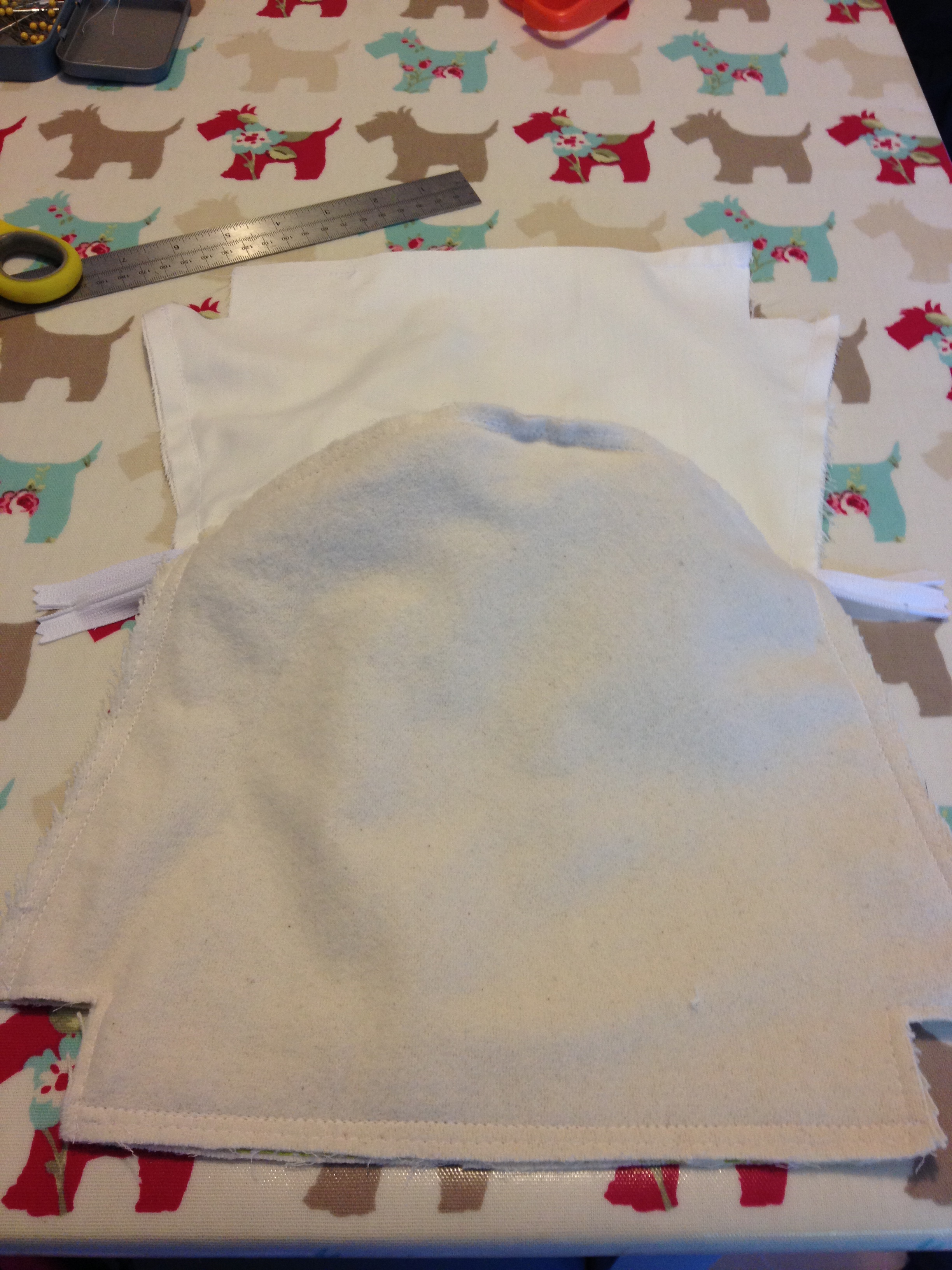 Now go to the L shaped bit on the bottom of each side and open them out so that the seams join. Sew across using a 1cm seam. Again, I would reinforce this section (so sew across it again).