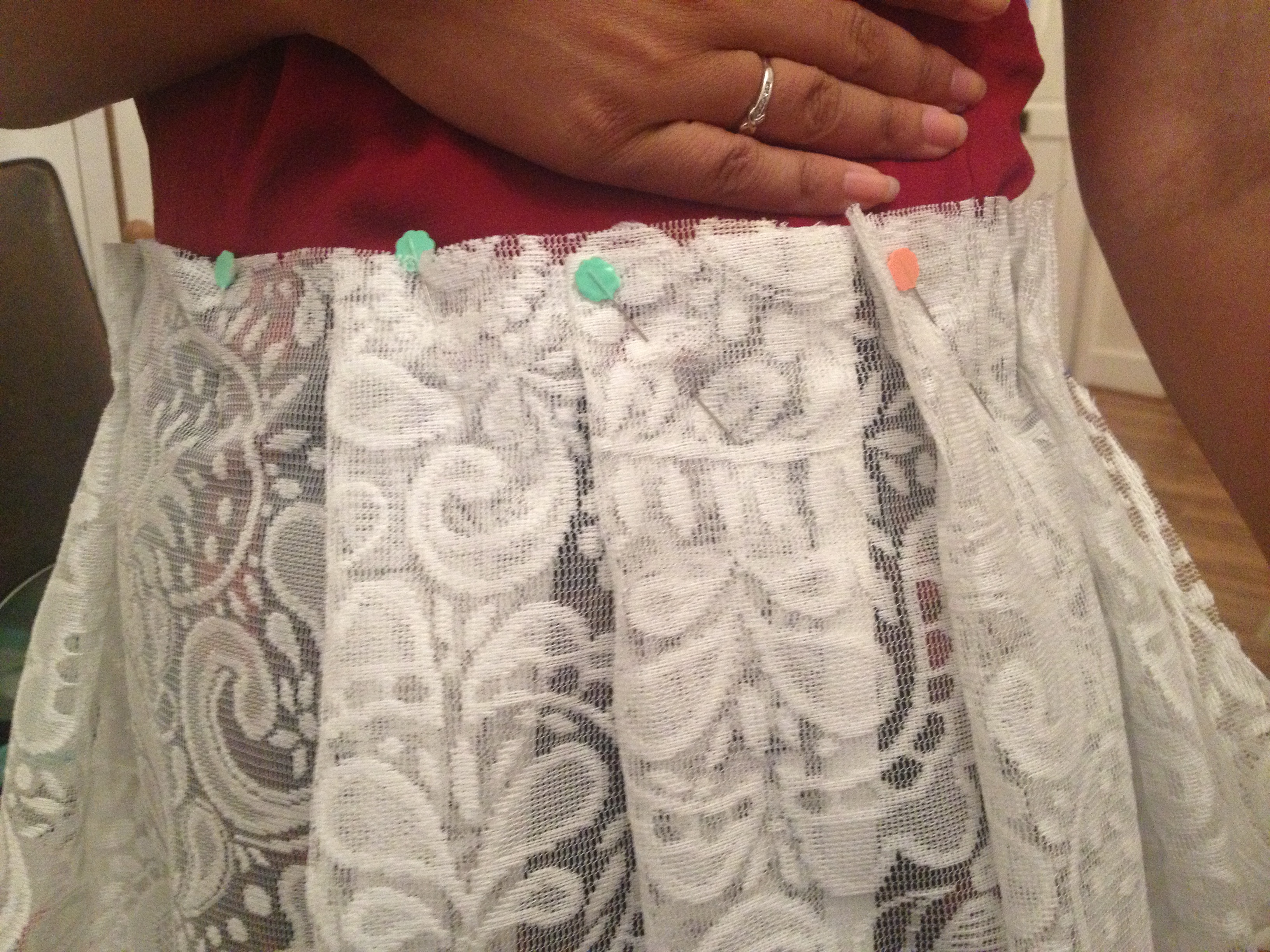 This next one? Panels of lace fabric that we sewed together to make up one very wide piece of fabric… pinned the pleats on her pencil skirt and created this beautiful skirt…. just the zip and waistband to finish, plus the under skirt and voila !