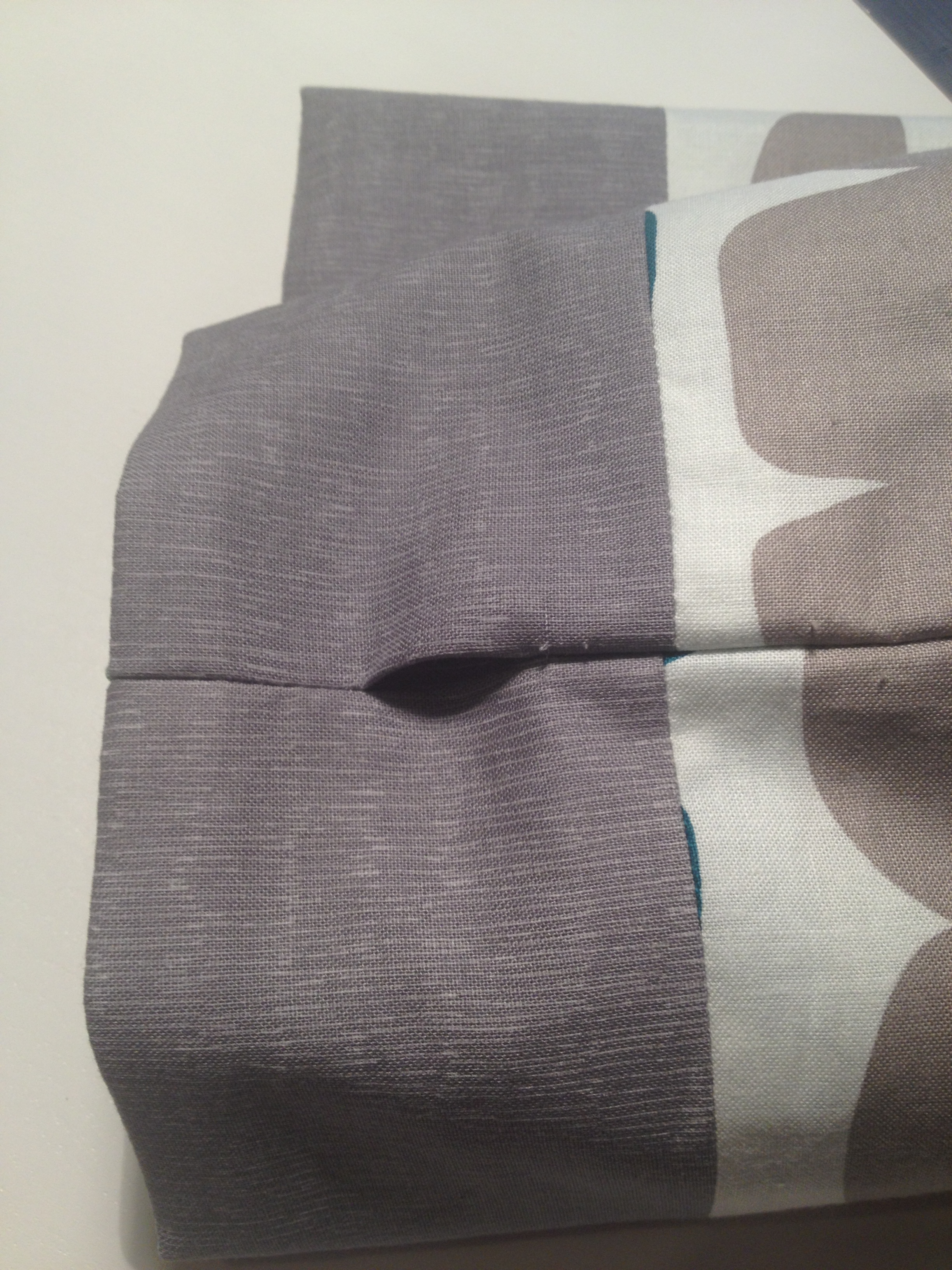 Push the bottom of the lining seam against the side seam so that it makes a point. This can be a bit fiddling so don’t give up. The two seams need to lie flat on each other..