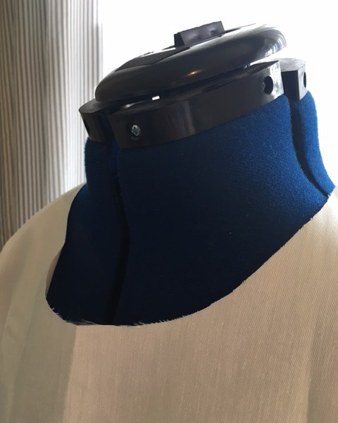 Step 1 – Before putting the facing in to the garment, try the dress on and, if the neckline is gaping, pinch away the amount and measure it. For our example it will be 1.5cm.