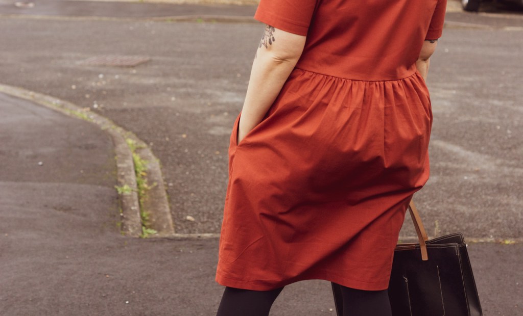I realise that I haven’t mentioned the fabric! I try to sew as sustainably as I can and therefore most of the fabrics in my stash are second hand. This rust-coloured cotton came from a charity shop in York – I got 6m for £4! This dress took roughly 1.8m and so I still have plenty left and have plans to make a quilted jacket with the rest – matching dress & jacket, anyone?!