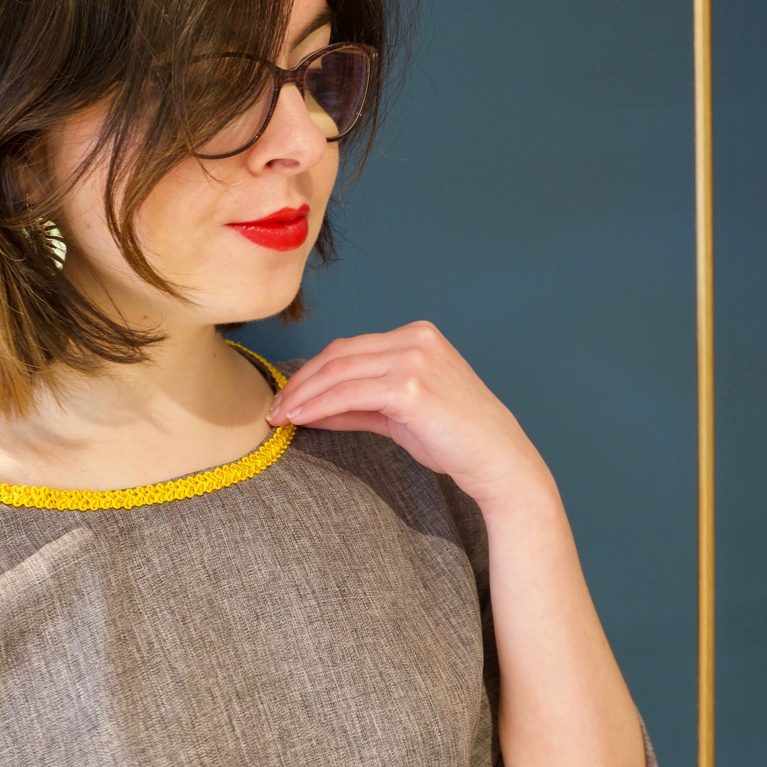 I have had this bright gold interlocked trim laying around for a long time and have used bits of it here and there to add a Chanel-style feature to garments. On The Sheath Dress, I have sewn it around the neckline, using a zig-zag stitch. Take care when sewing around the curve, so as not to pucker the neckline.