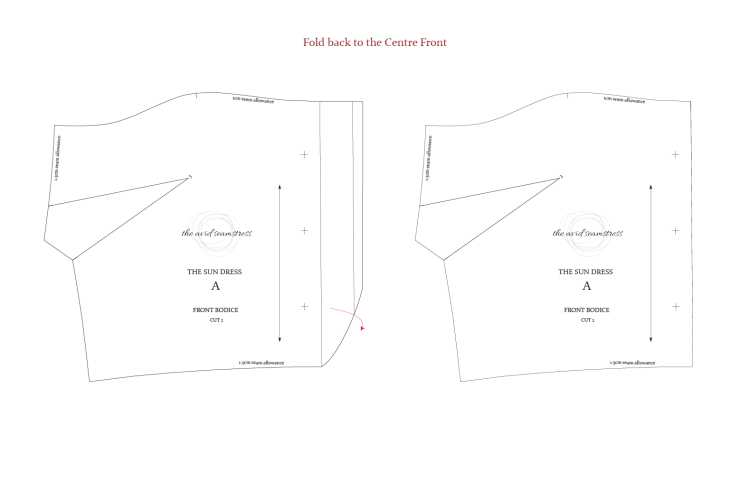 Ok, now we have a copy of our pattern, we can get started. Firstly, fold your front bodice pattern piece along the line next to the button balance marks to help find the centre front: