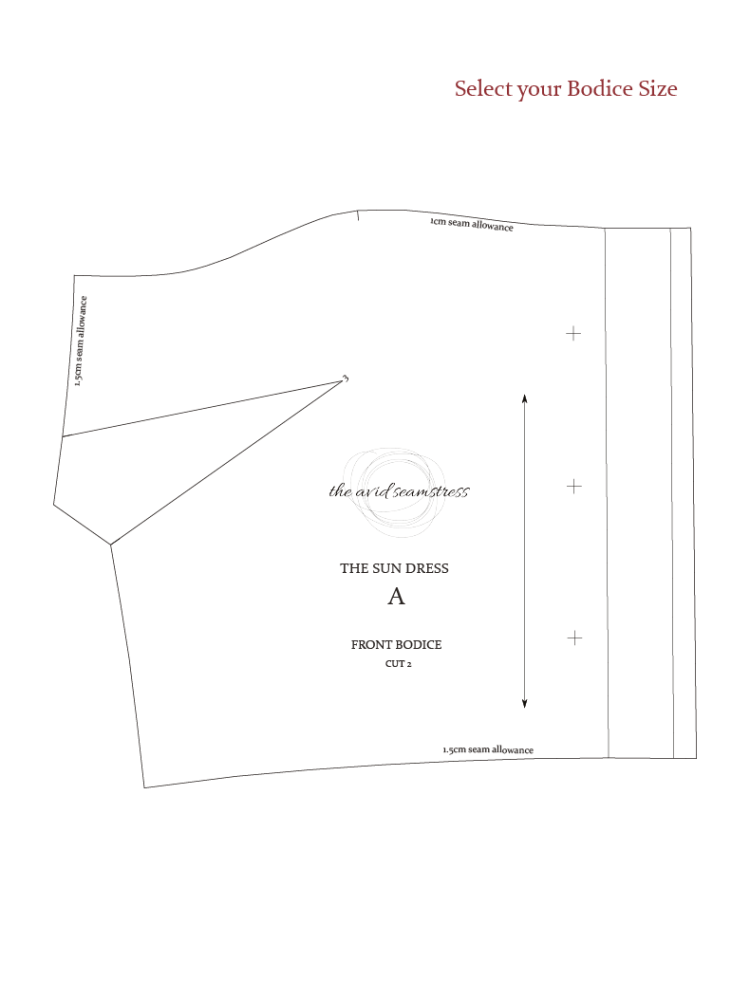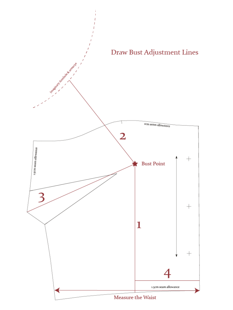 If your bust measurement is 94cm but your high bust measurement is 86cm, the difference is 8cm which means you’ll have to adjust your pattern by 4cm as we are working with half the measurement on this pattern as it is in two pieces! We only need to work with half the measurement required.
