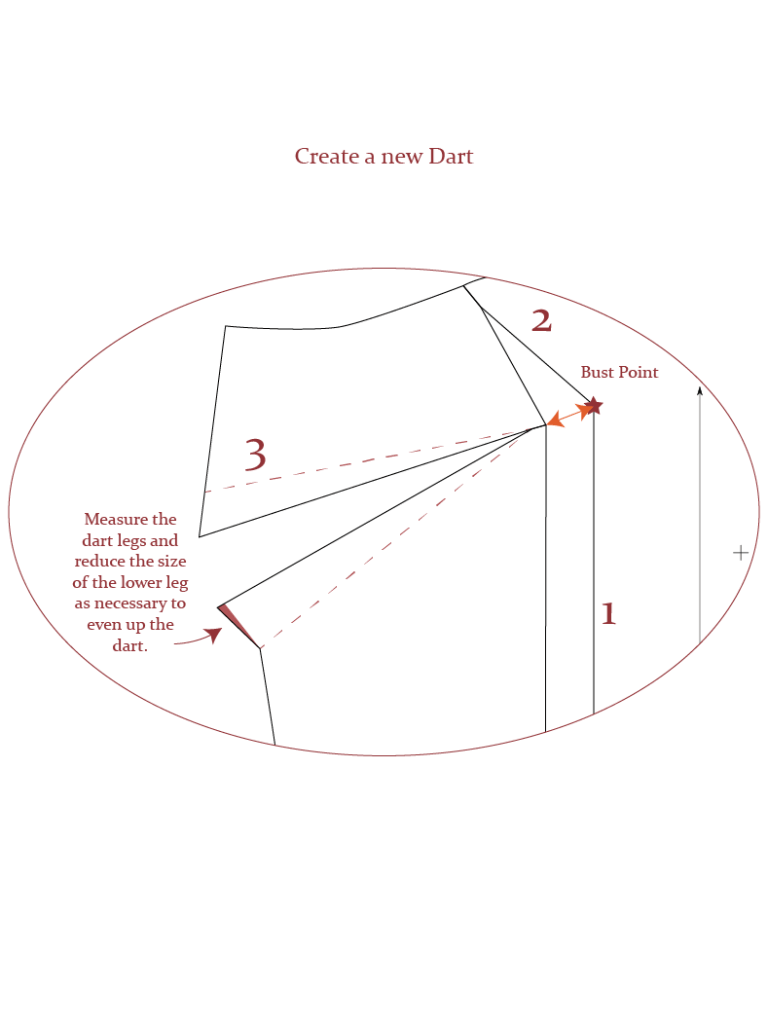 We now need to even up the dart which has been opened up. Using the original dart legs, finish the new dart 5cm from the bust point, even up the dart legs, you might find the lower leg is longer than the top leg. Measure the top leg reduce the lower leg as necessary so they become the same length.
