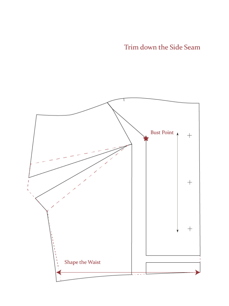 You may also notice that there is now extra width on the waist from opening up the line number one. Remember the measurement we took before chopping into the pattern? We are going to need it now, starting from the folded back Centre Front edge, measure to the side seam and mark this point. From the bottom leg of the dart, draw in a new side seam, the amount you reduce the side seam by is up to you, you might want to keep this fullness in or you could even create a dart with it for added shaping at the waist.