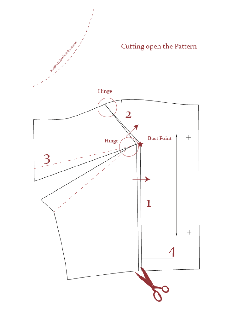 Now for the fun bit! Using a pair of paper scissors, cut up line number 1 through the bust point up to line number 2 stopping about 0.5cm from the edge of the pattern. This creates a little hinge for us to use and open up the pattern.