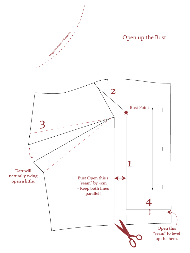 Now for the fun bit! Using a pair of paper scissors, cut up line number 1 through the bust point up to line number 2 stopping about 0.5cm from the edge of the pattern. This creates a little hinge for us to use and open up the pattern.