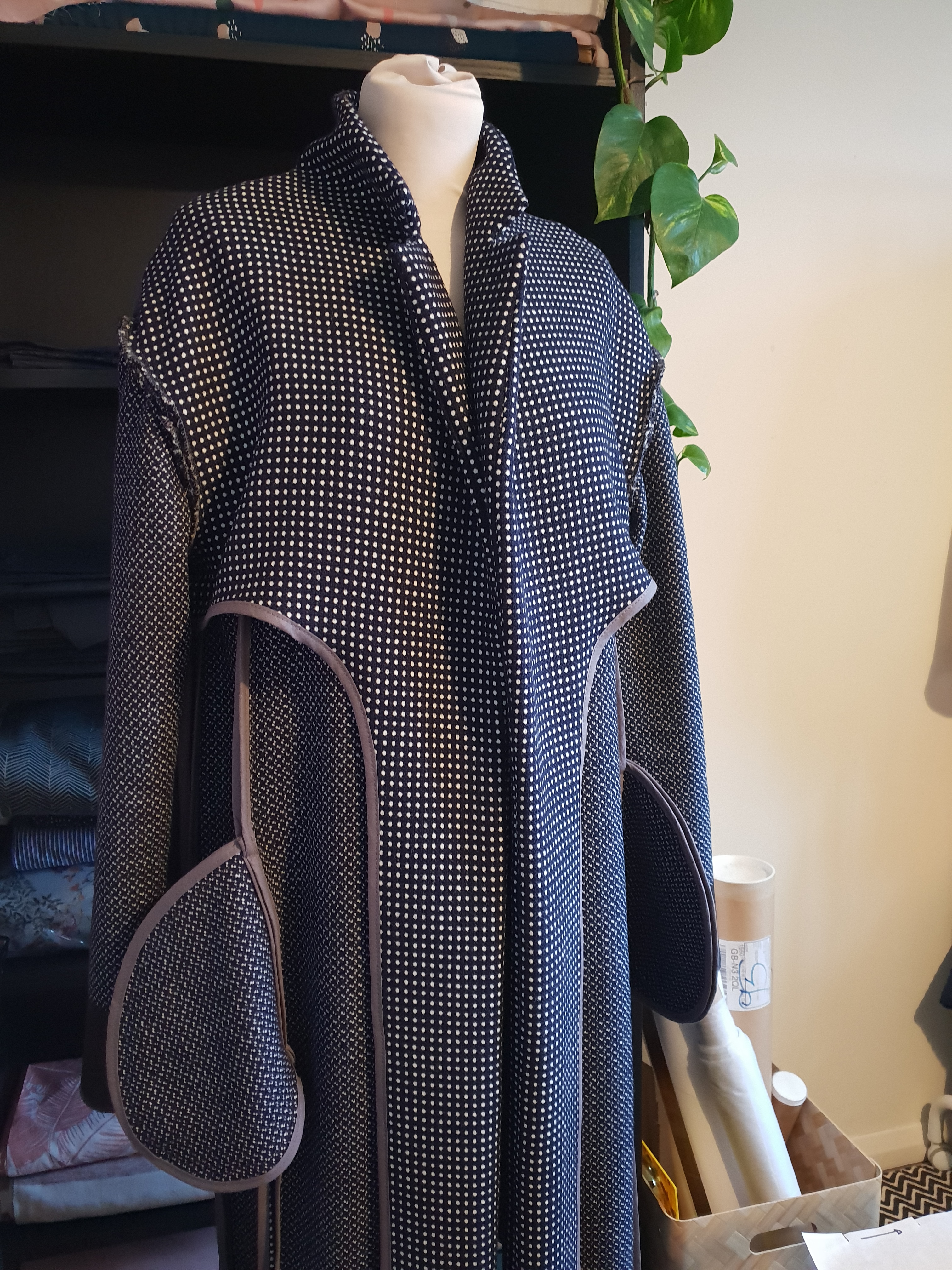 Essentially it means that, as shown in these two images, the front of the coat has a facing that is made out of the same fabric as your main fabric. The back of the coat has a lining that is made out of lining fabric and extends to just under the armhole.