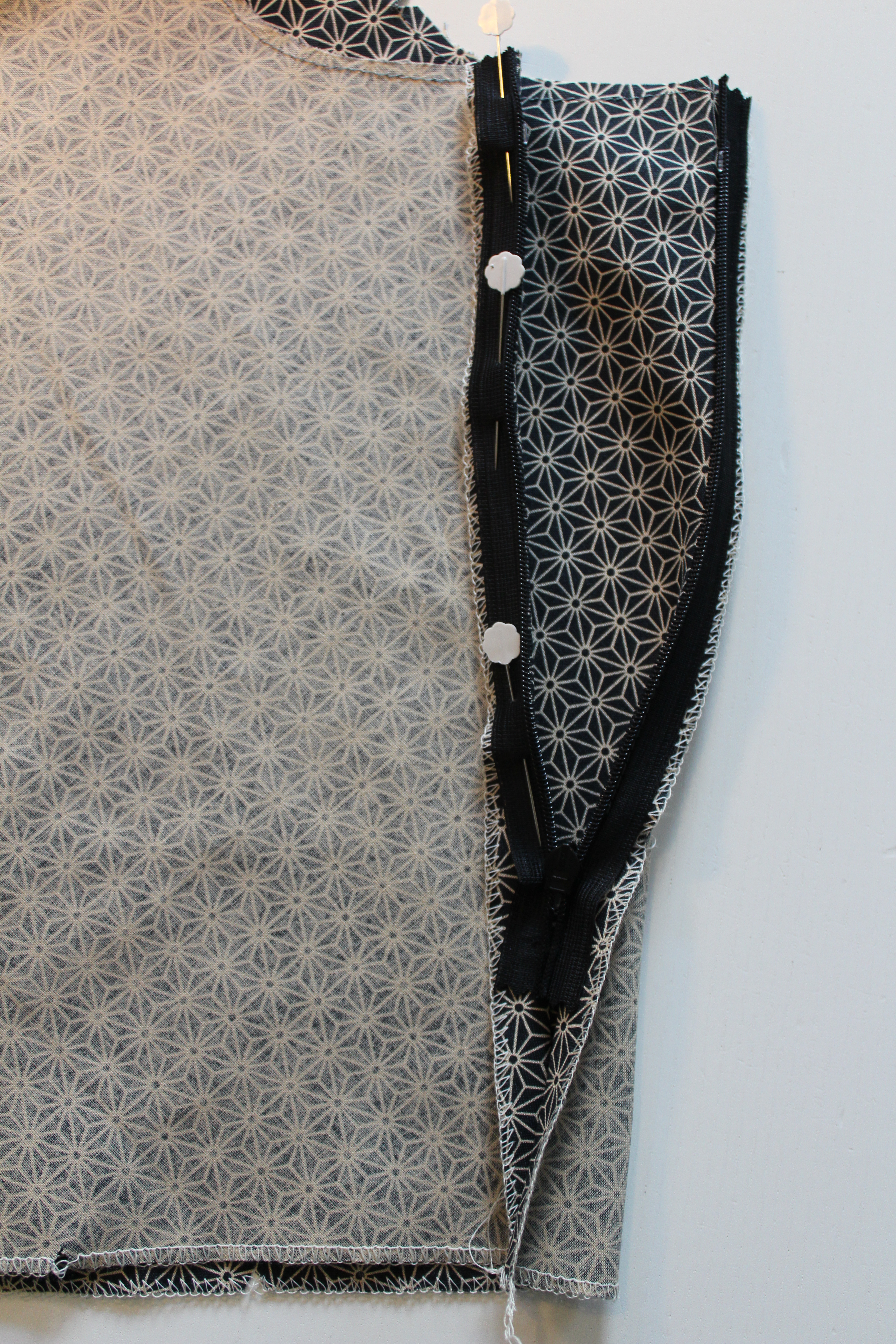 6. Take the loose zip side and pin it to the left side of the garment. Only  pin  zip  and
