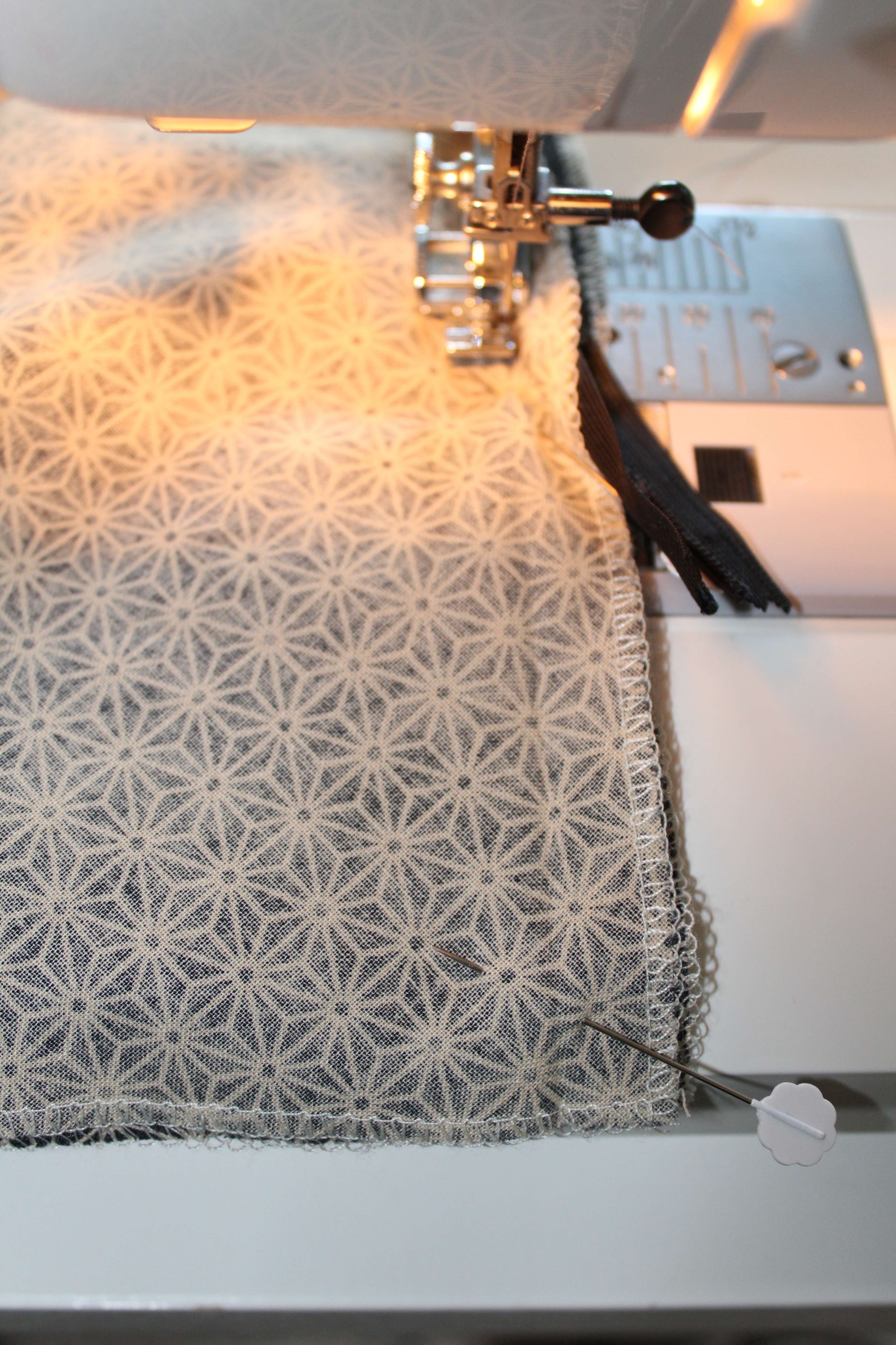 4. Using your zipper presser foot and starting from the top of the zip create a row of stitches next to the zipper teeth. Don’t sew too close to the teeth – just a few mm next to it. Sew until as far down the bottom of the zip as you can. Don’t forget to reverse stitch at the top and bottom of the zip.