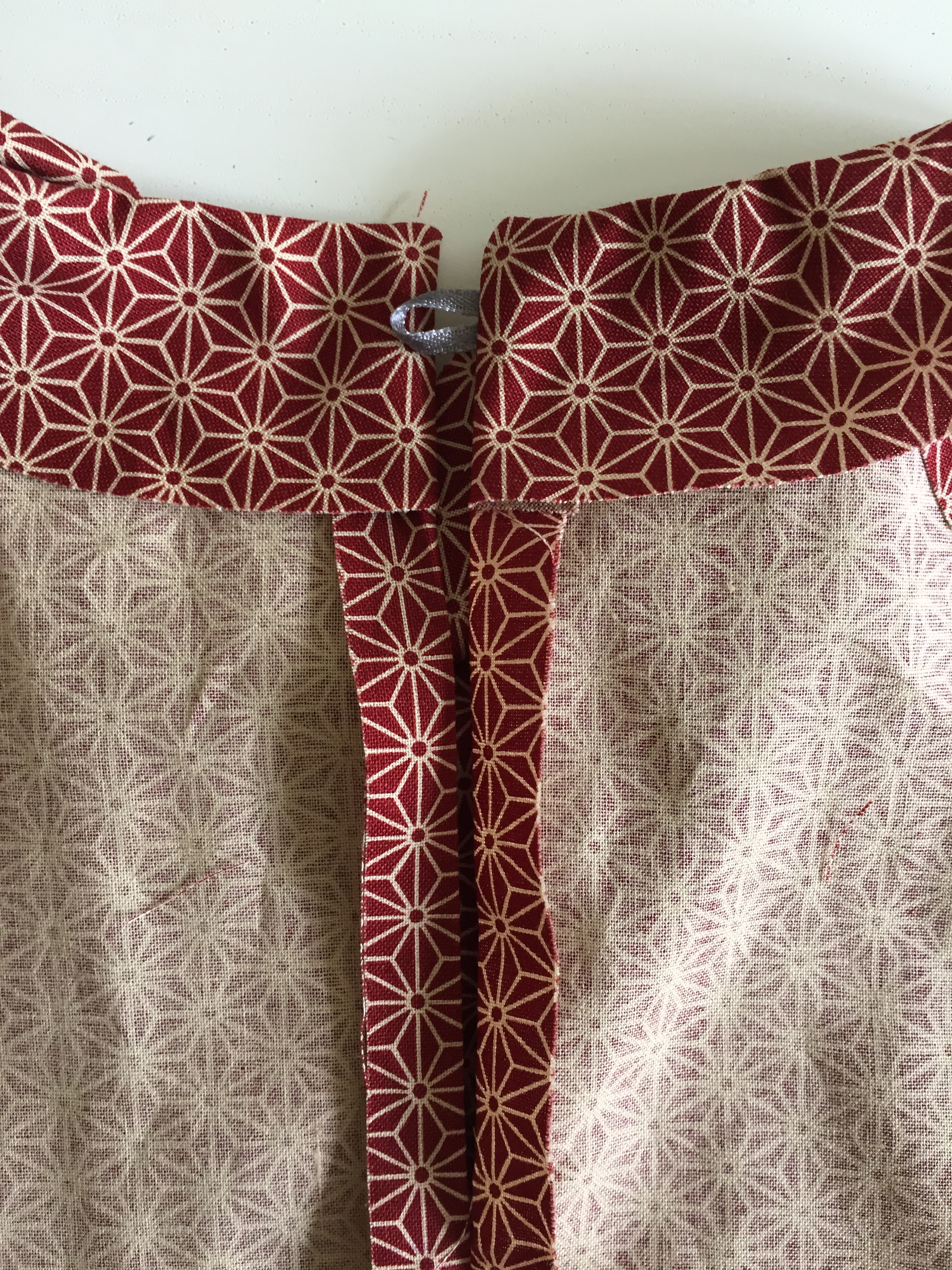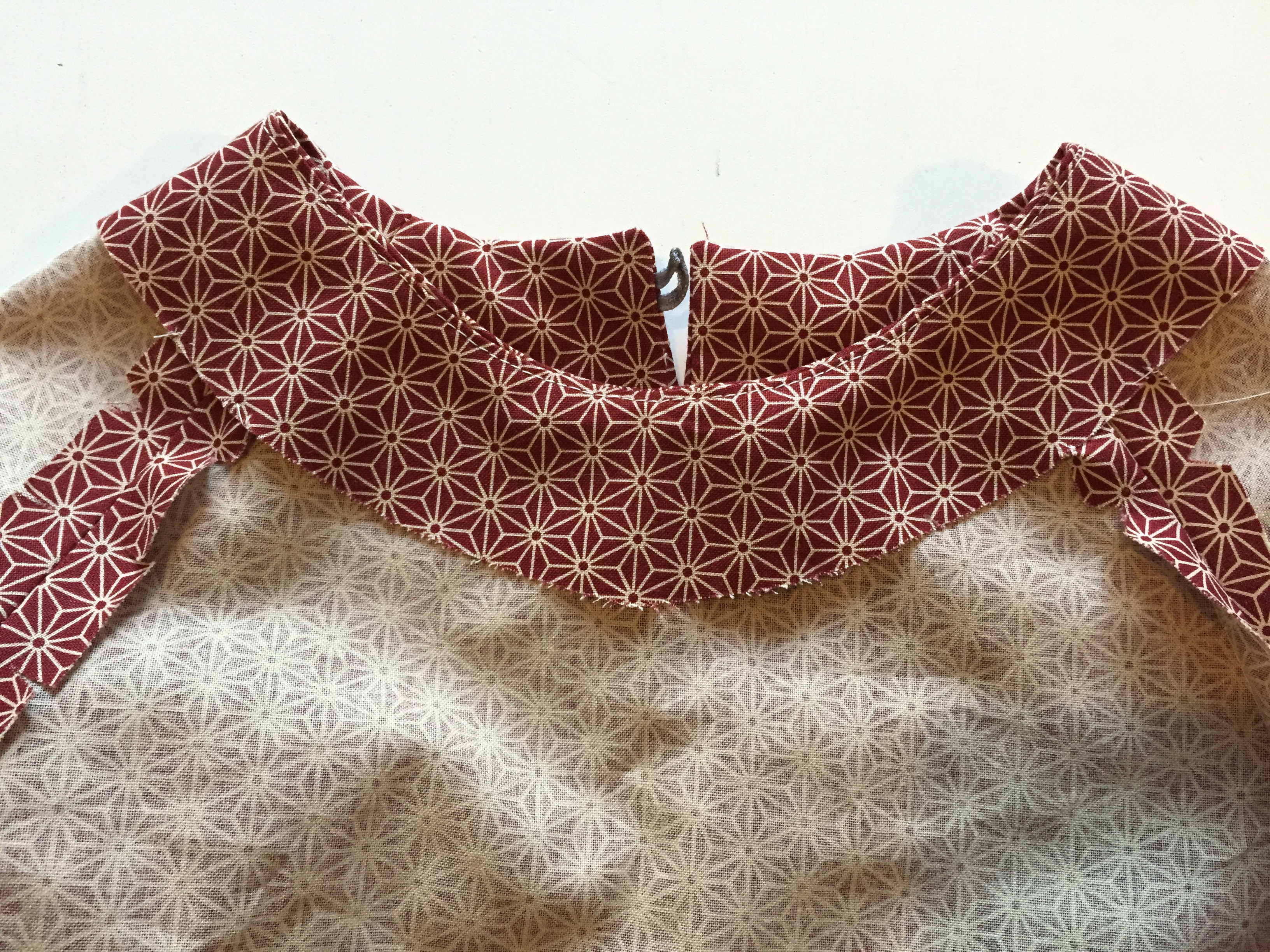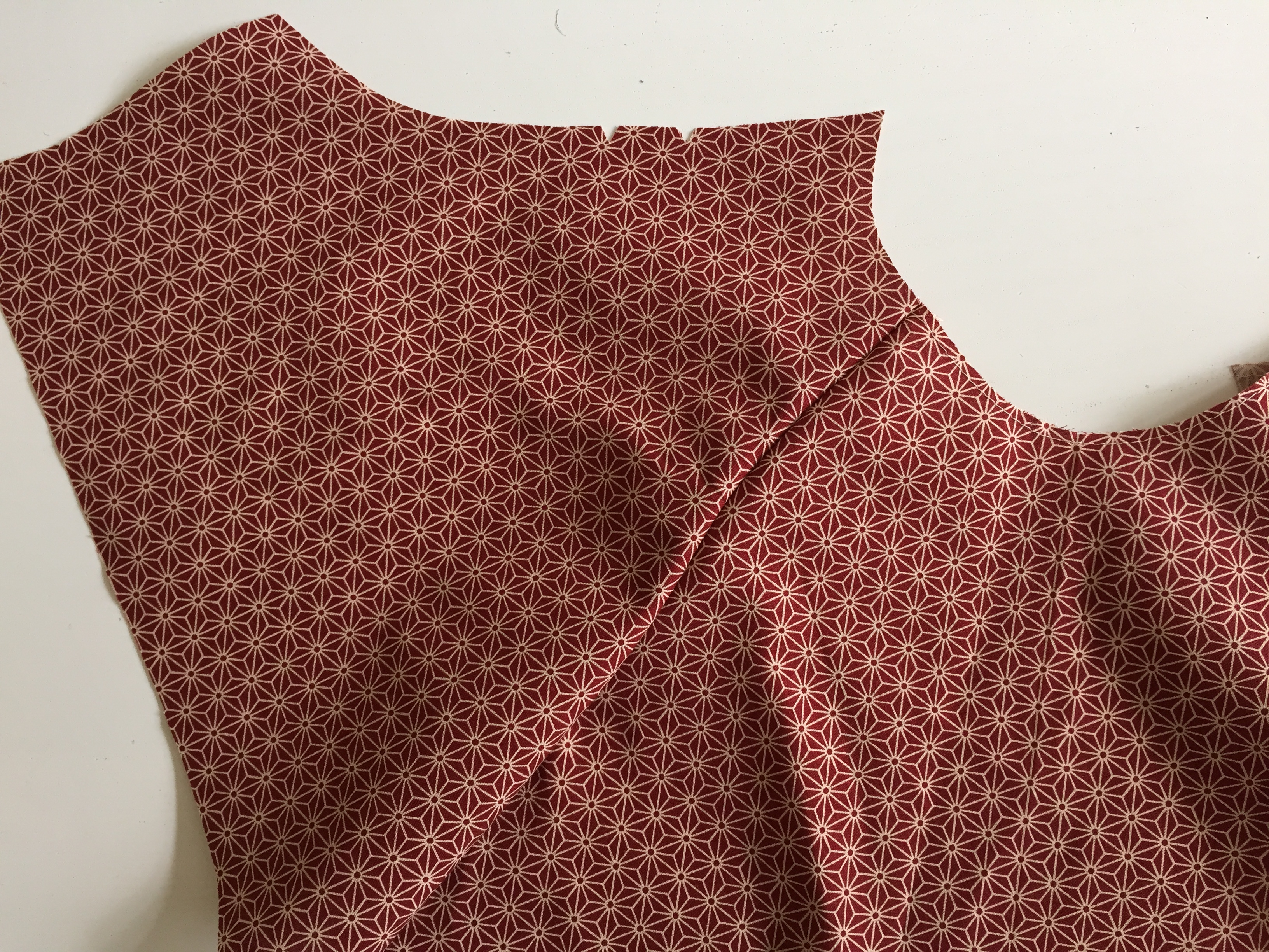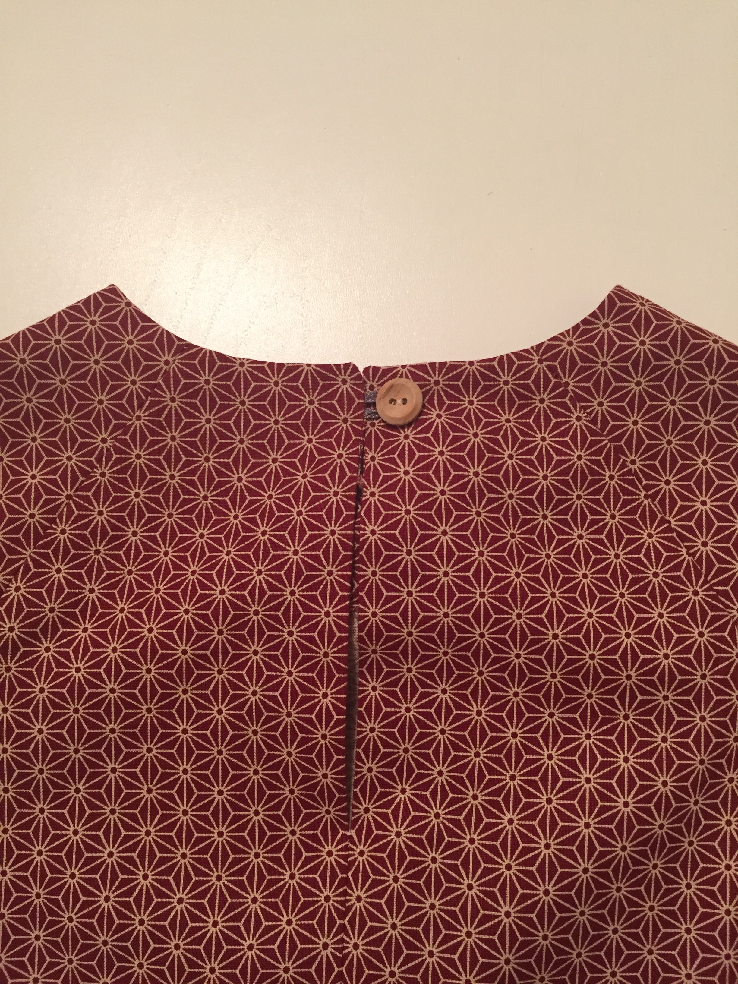 Push the corners at the CB and spend your time making sure the points are nice and neat. Again, check now that when you lie your two back pieces against each other they fit perfectly. You can now hand sew your button into place.