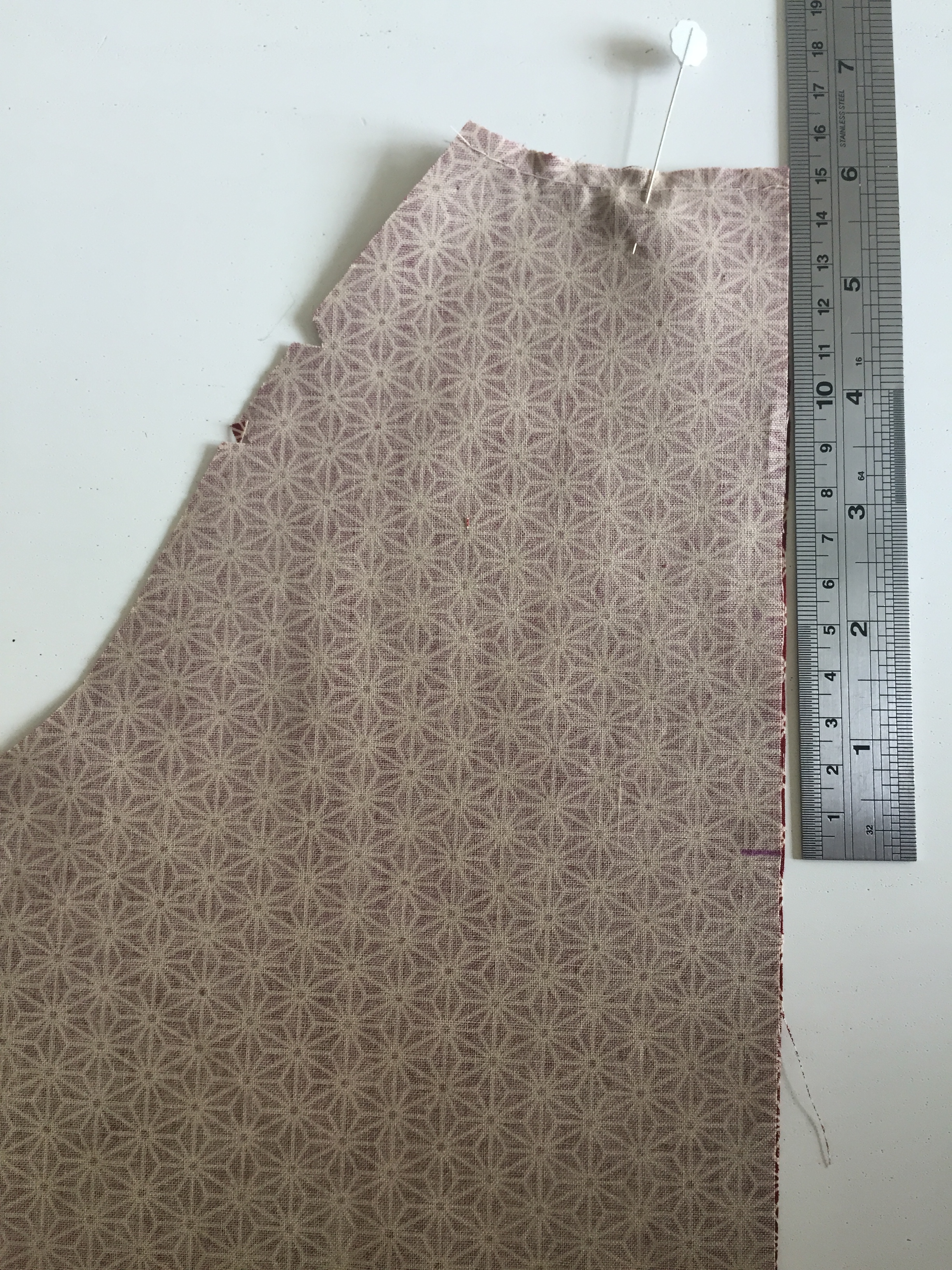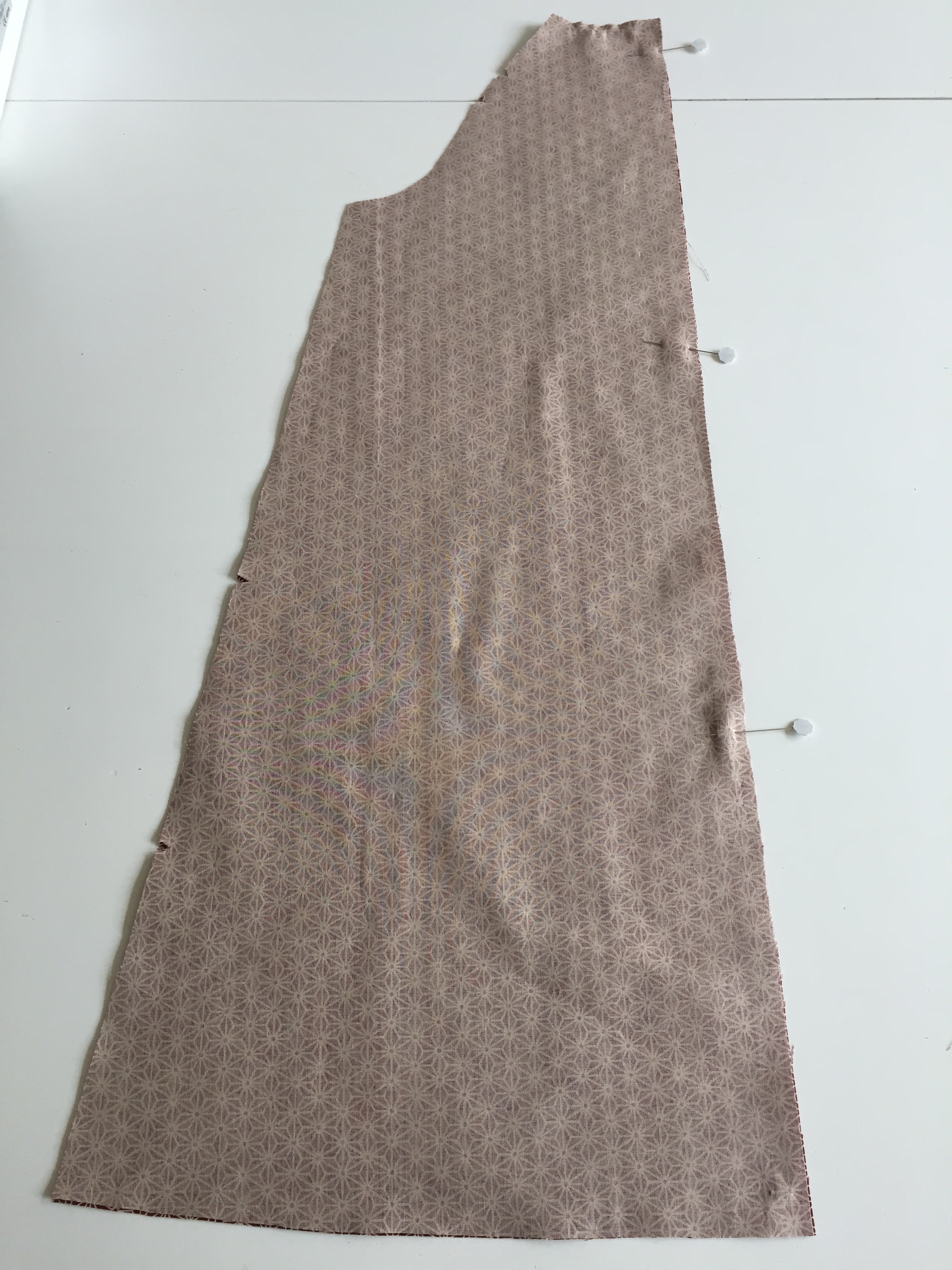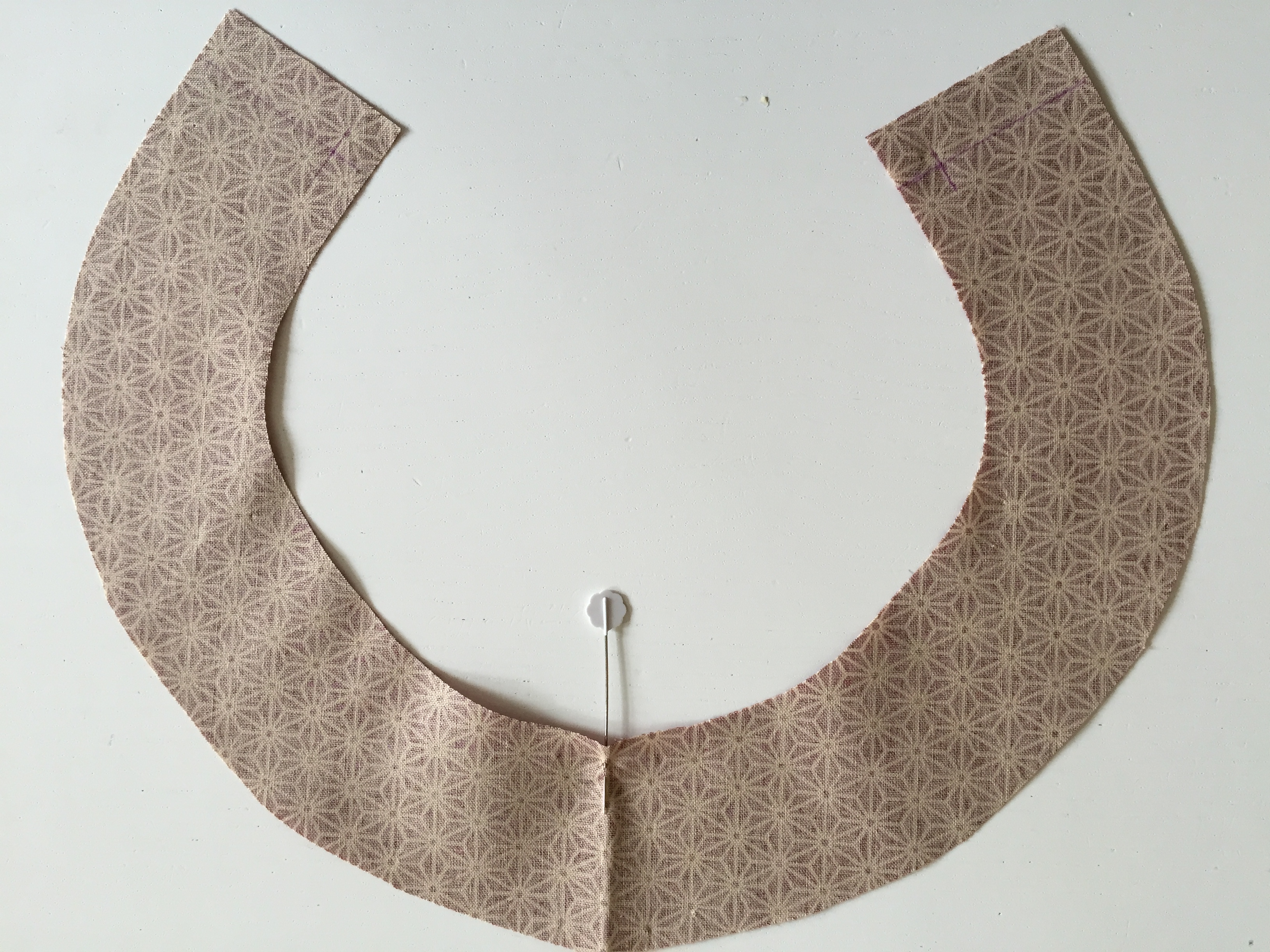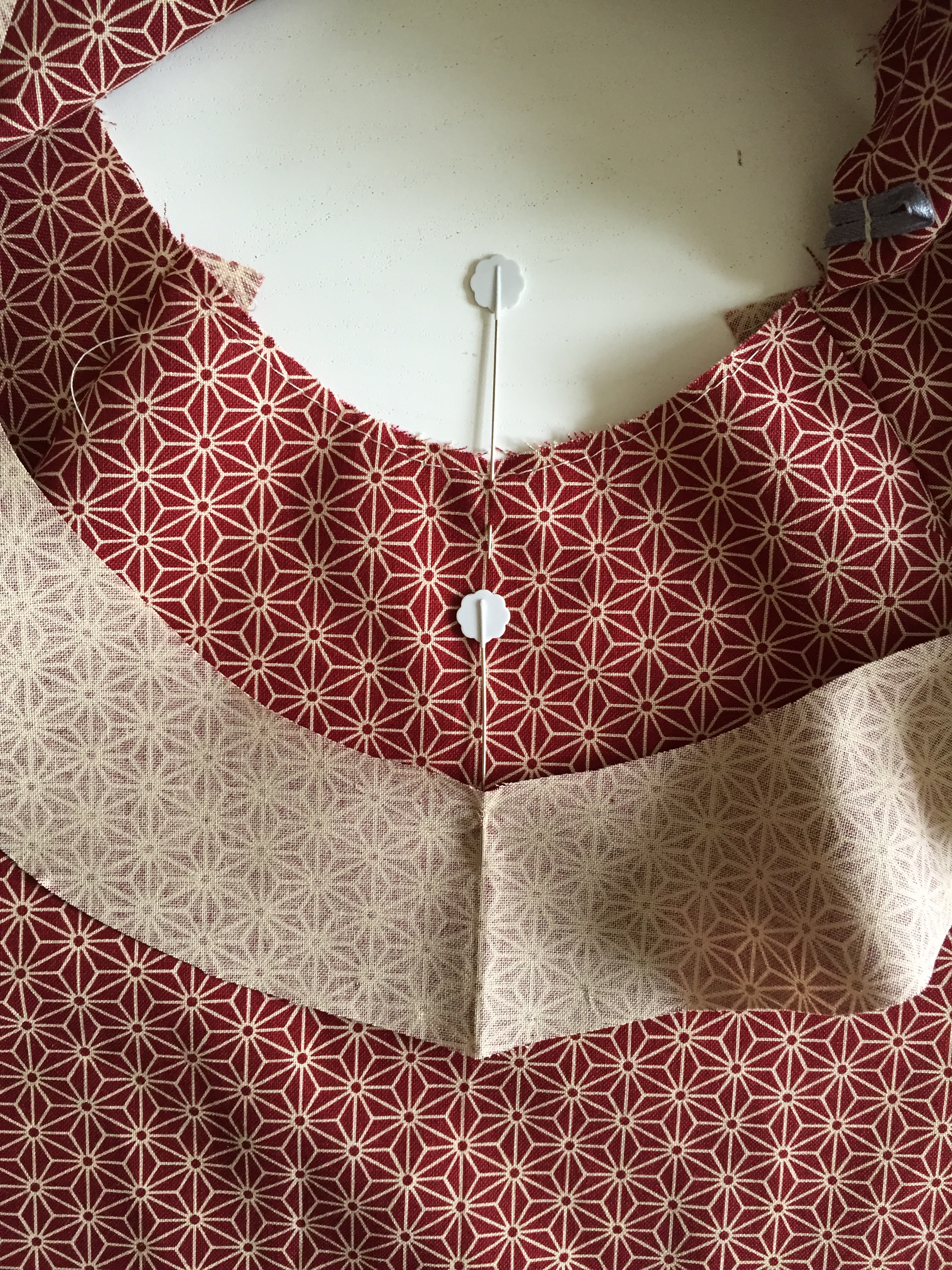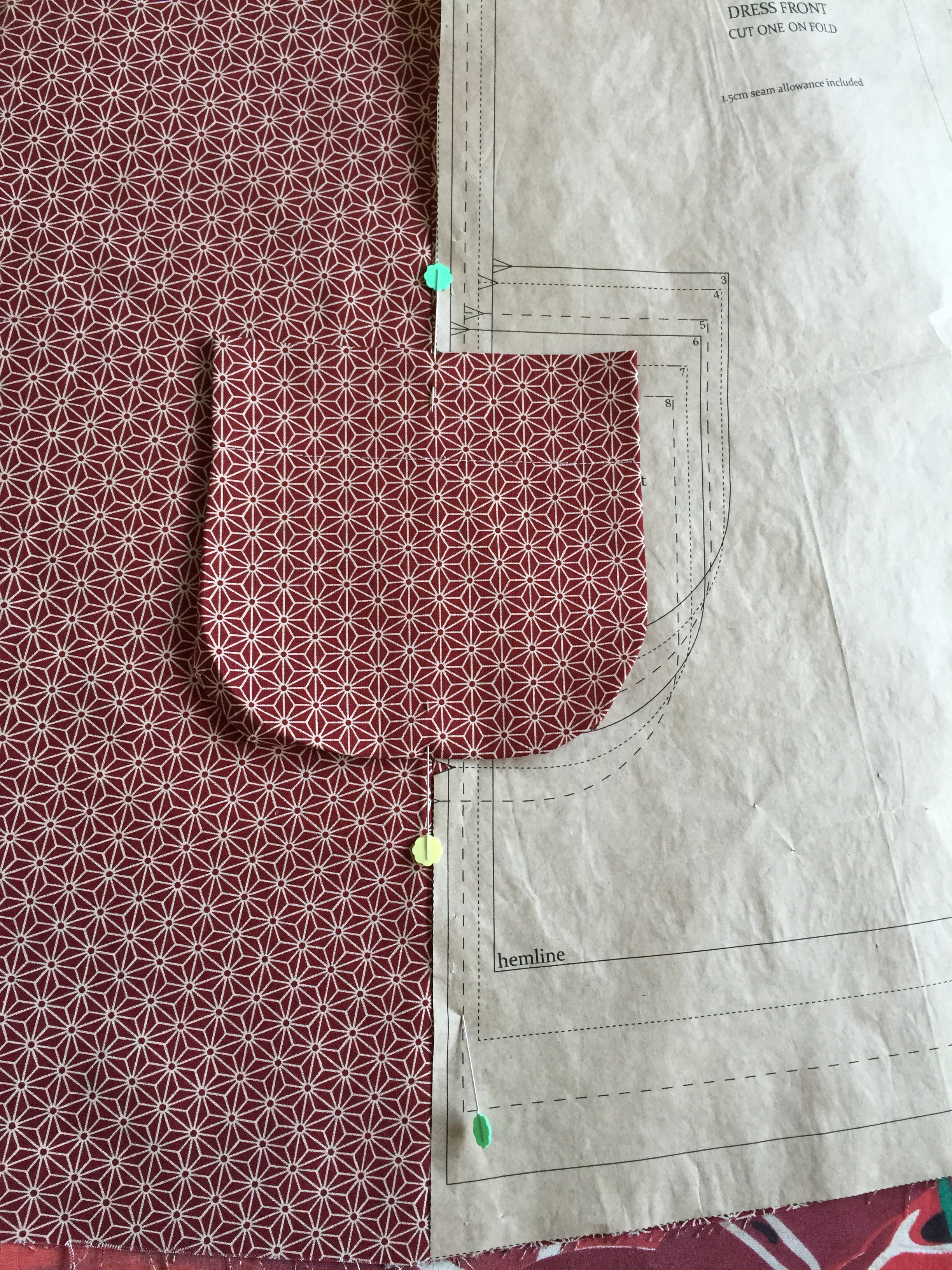 Place the front of the dress with the right side facing you. Place a pin where the fabric was folded when you cut it out – this is the CF. Place your facing piece down onto the dress. Right sides together, lining up the pins – CF on the facing and CF of the front of the dress.