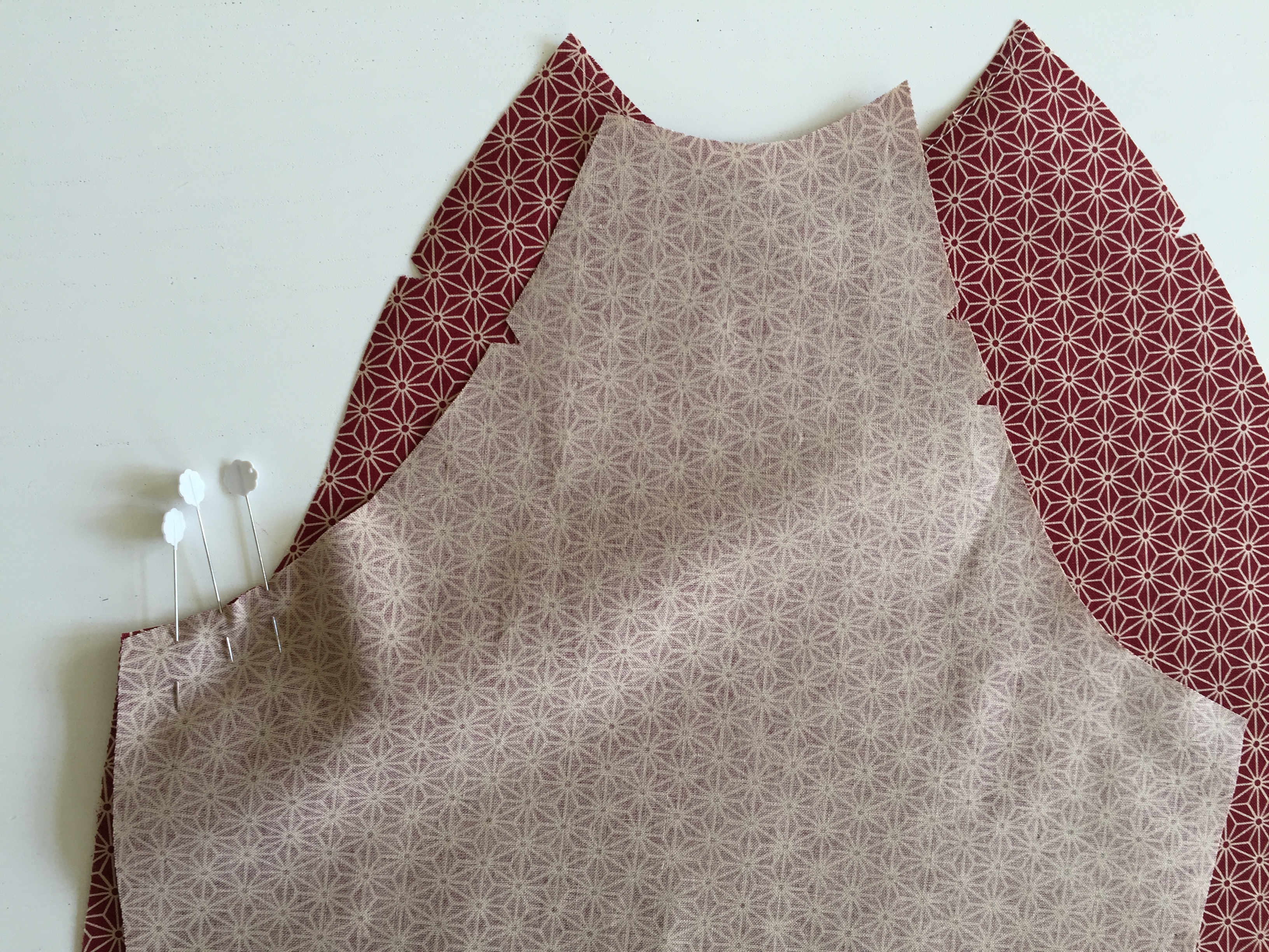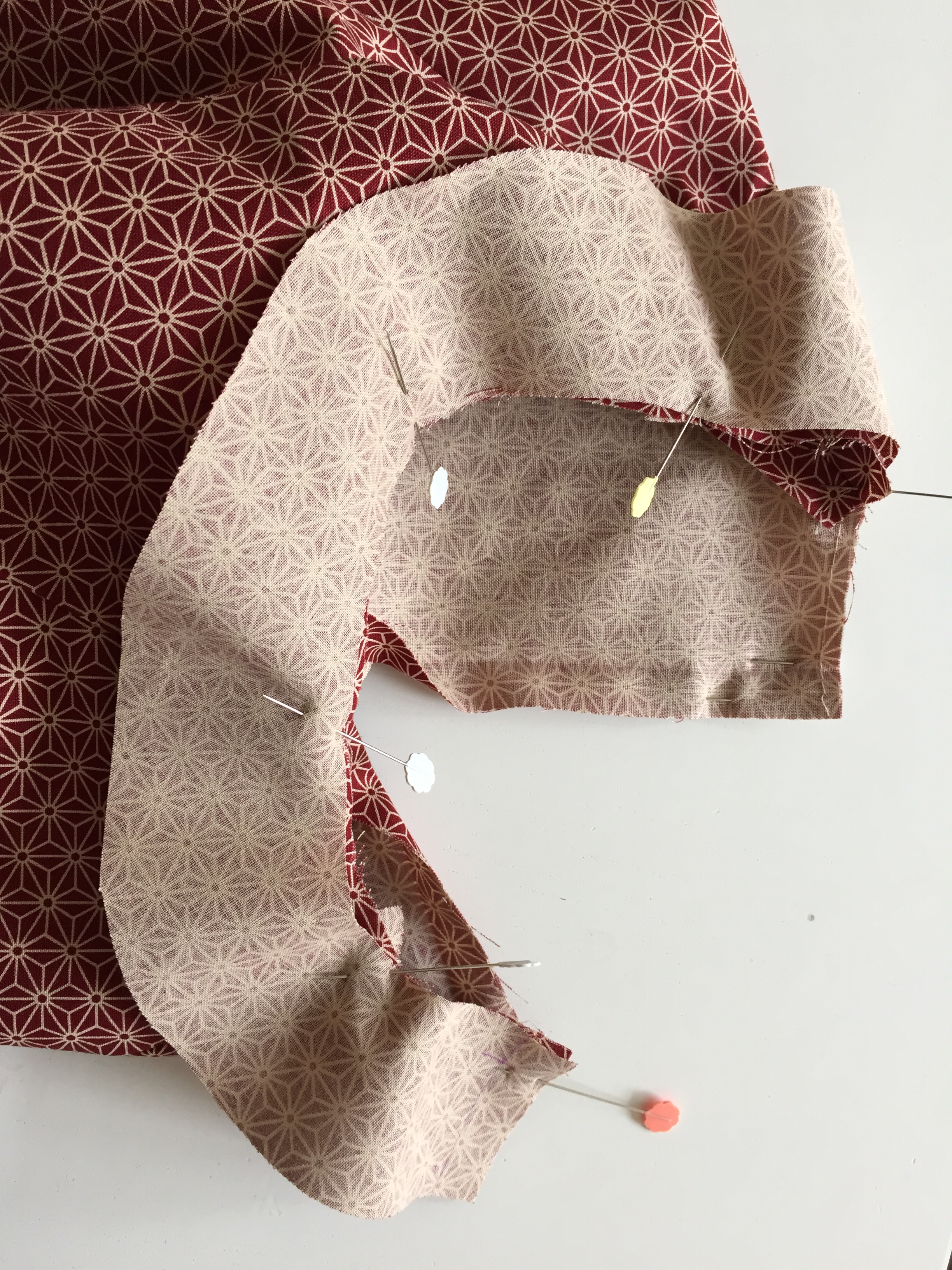 Move up and pin the notches together. At the top of the sleeve, align your pieces together as shown.