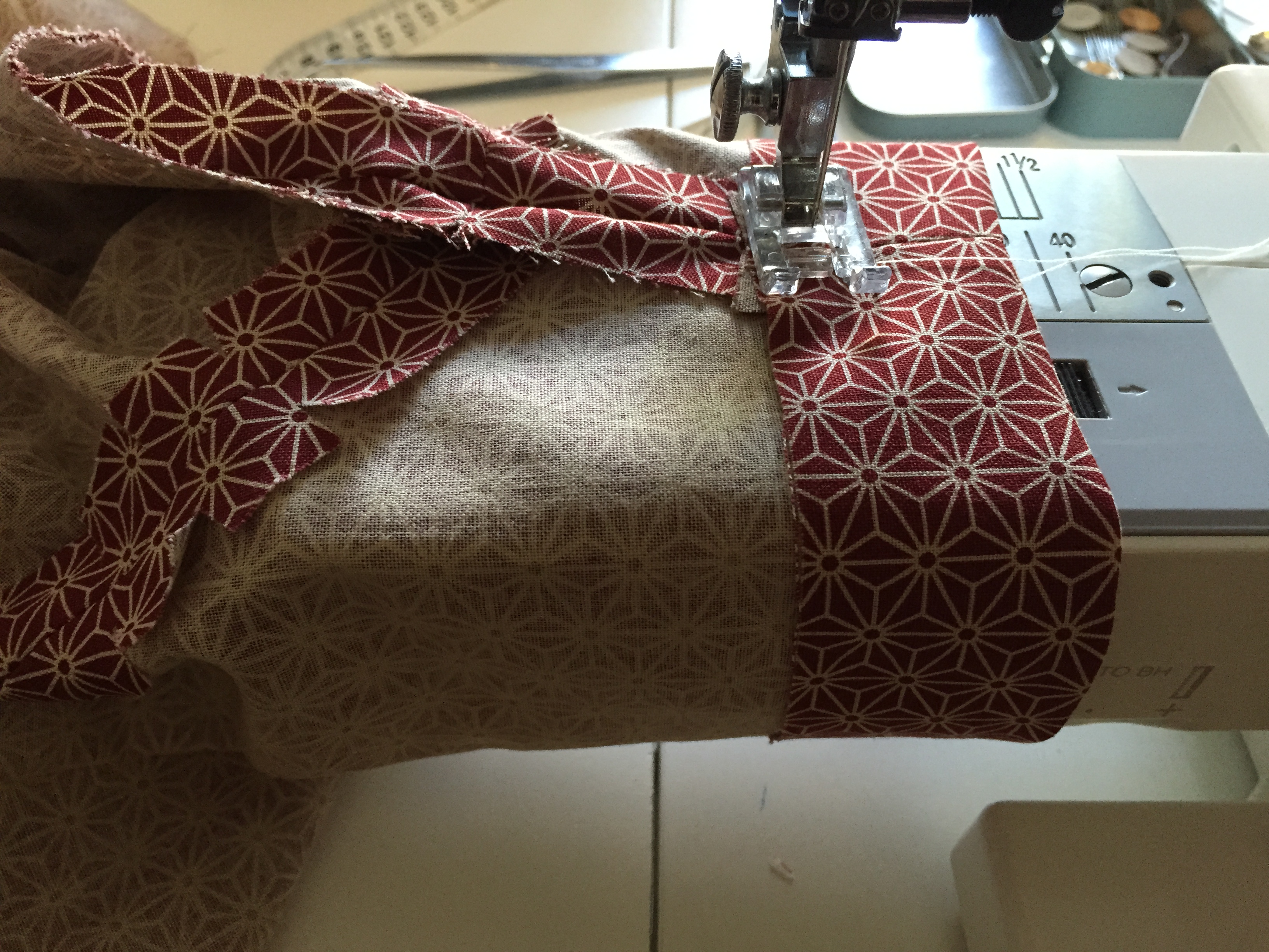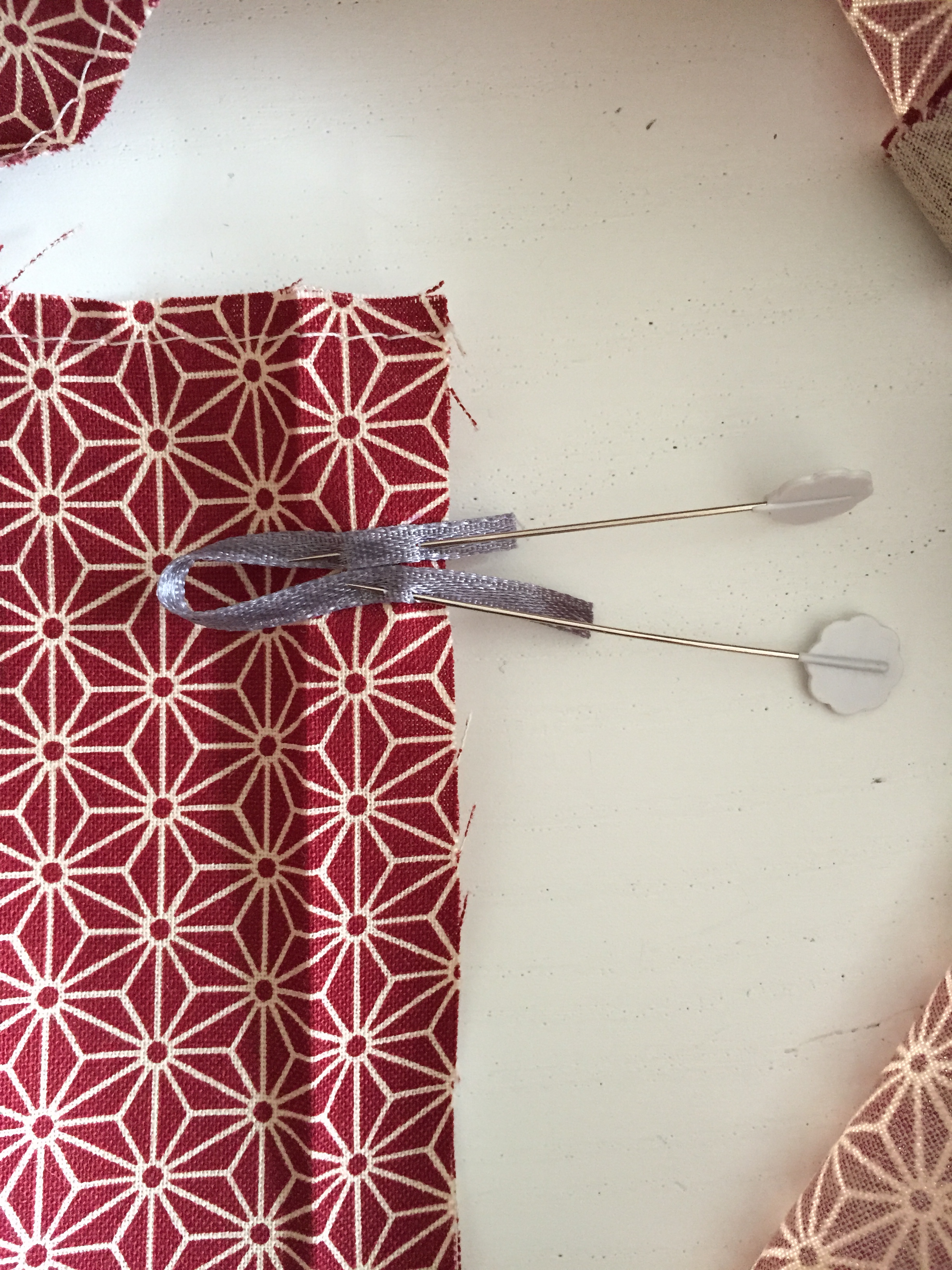 Create a row of stitches, using a 1cm seam allowance, to hold the ribbon in place.
