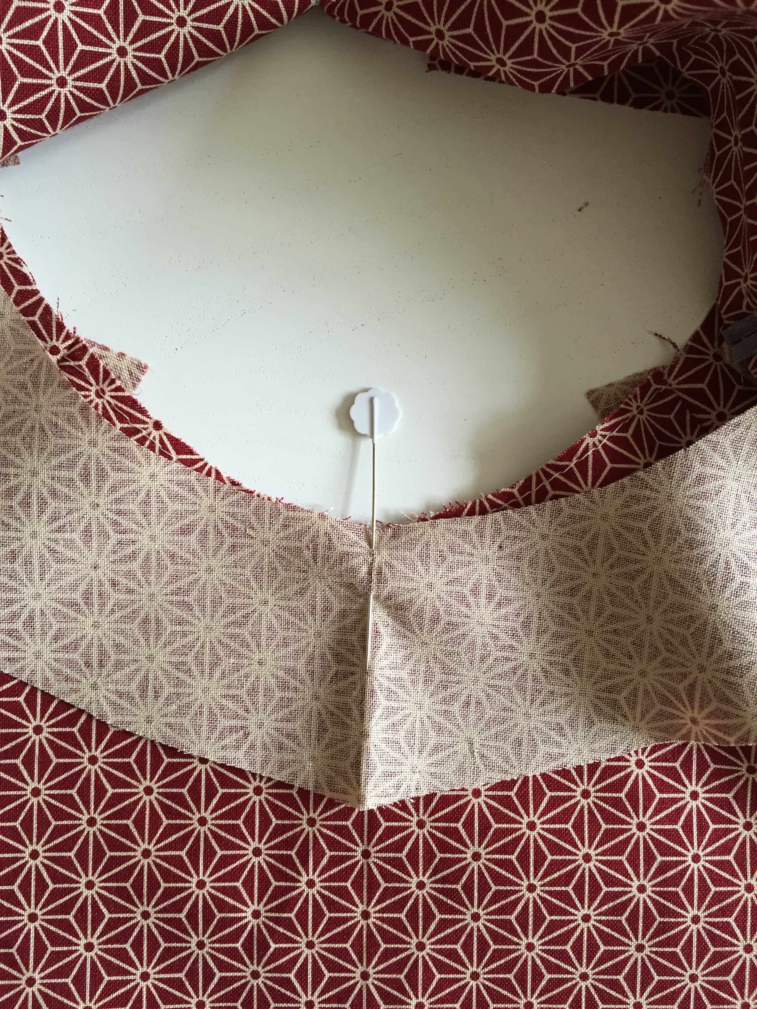 Pin the facing to the neckline, ensuring that the edges are flush and seam allowances are open.