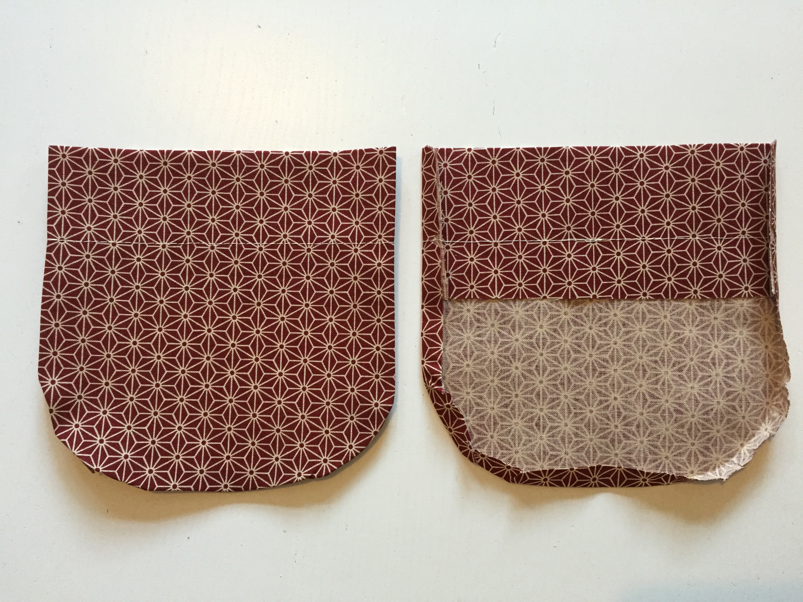 On the wrong side, fold over your pocket on the first notch. Then, on the right side, create a row of top stitches across the pocket from second notch to second notch.