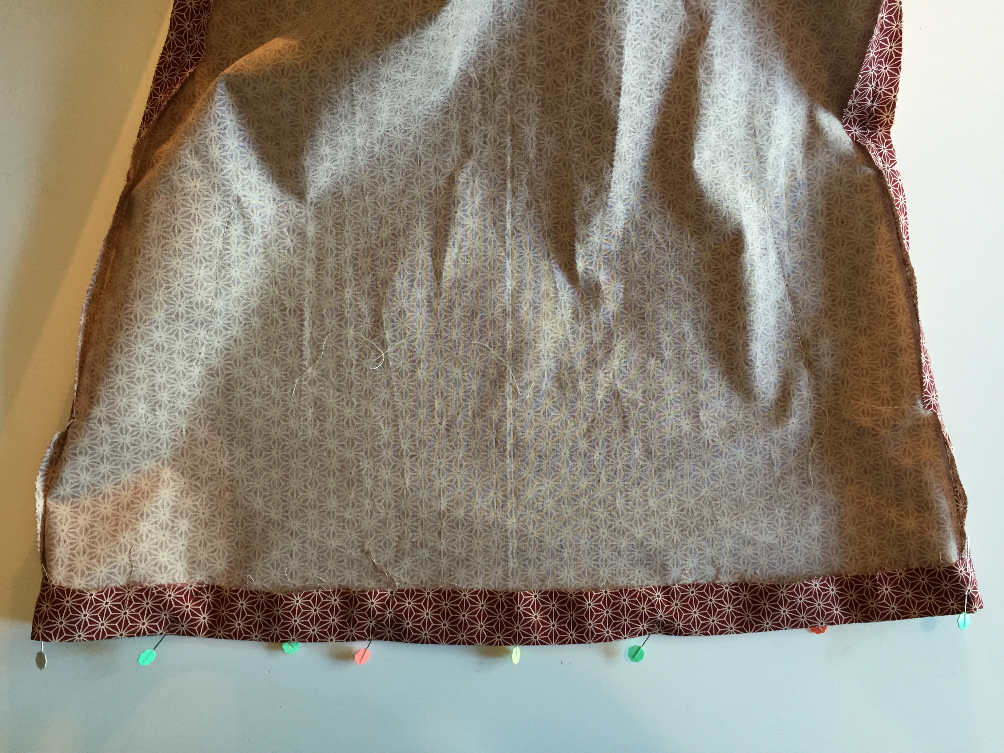 On the bottom edge of the dress turn up the hem – 3cm – and pin in place, ensuring seam allowances are open at side seams.