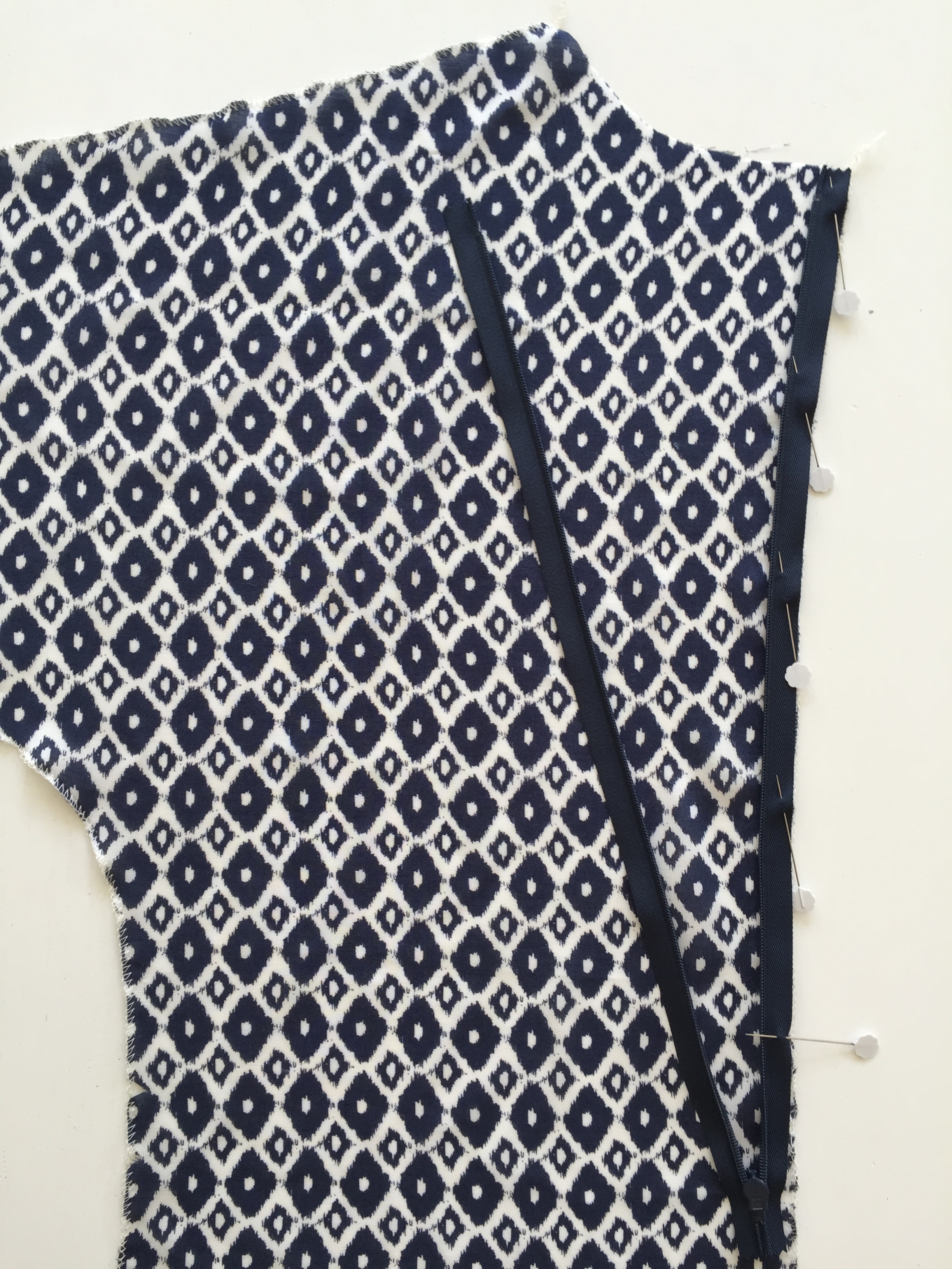 Keeping the two back pieces right sides together, pin the remainder of the bottom CB edge below the zipper – ensuring that the edges of the fabric are flush. Place a pin matching up the hem edges and then work your way between the zipper and the hem. If you used an invisible zipper foot to sew your zip to the garment, change the foot to a standard zipper foot.
