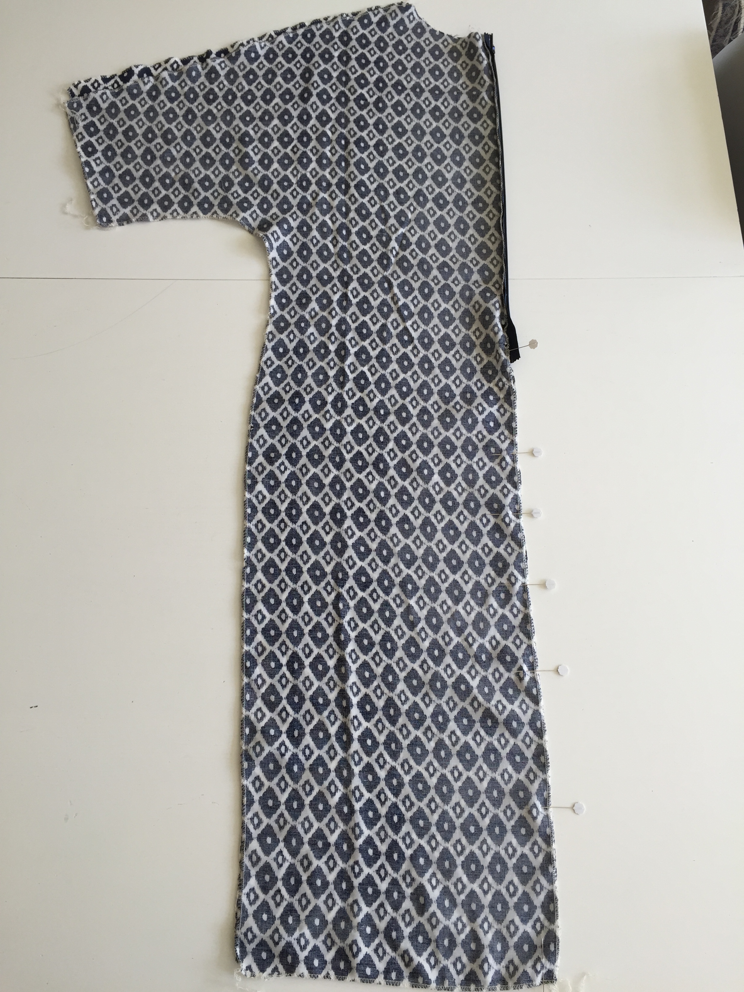 Move to the other side and attach the safety pin to the garment to stop the elastic from slipping inside. Fold your dress, right sides together, and match up the notches & elastic casing of the unsewn side seam. Sew this side together but don’t sew across the elastic casing.