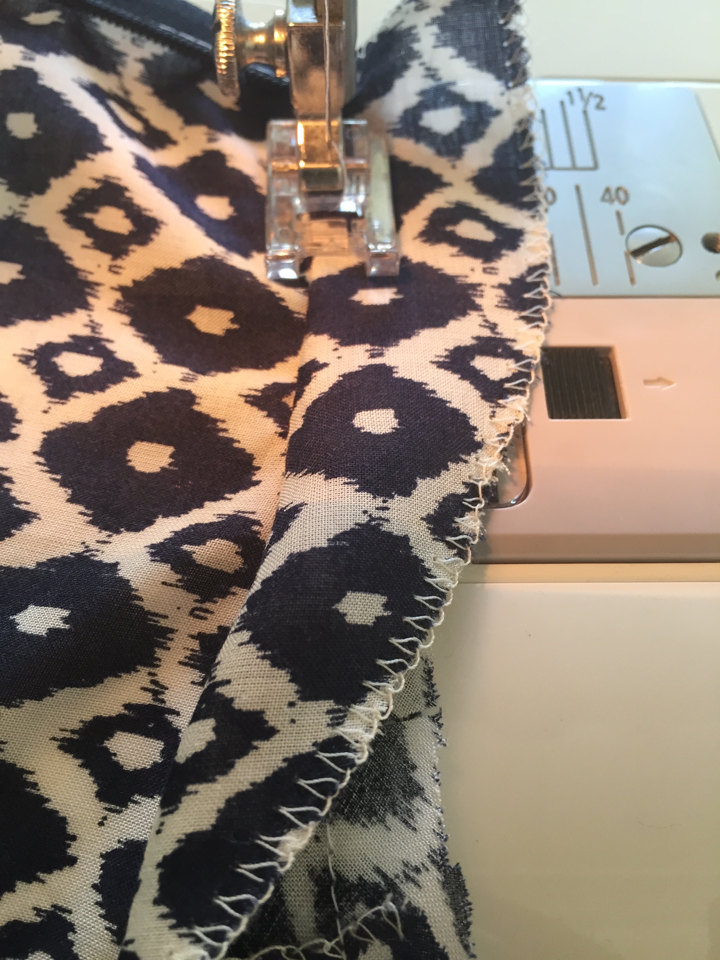 will notice you are much closer to the edge than 1.5cm. Once you are past the tricky zip area, slowly guide the fabric so that you are sewing on a 1.5cm seam allowance for the remainder of the piece. Once complete, iron open your seam allowance.