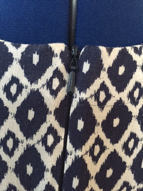 At the CB, turn in the seam allowance of the facing and fold over to the wrong side. Hand stitch the facing to the garment so that it lies flat, making sure no stitches are visible from the right side. Check that both sides are the same. Don’t sew too close to the zipper teeth otherwise, the zip won’t close easily.