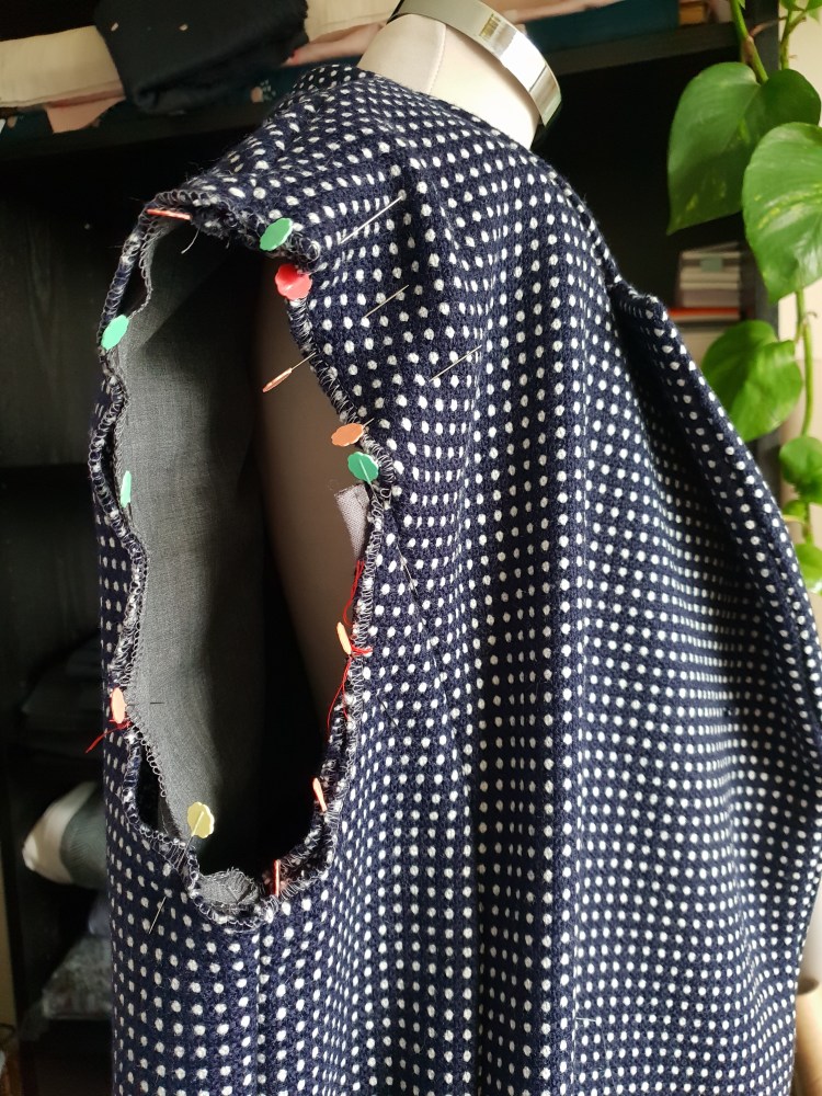 Before you pin the armholes together, re-mark the notches on the lining/facing side as, once these pieces are joined together, the notches will be hidden inside the sewn section. Sew the edges of the armholes together using a 5mm seam allowance.
