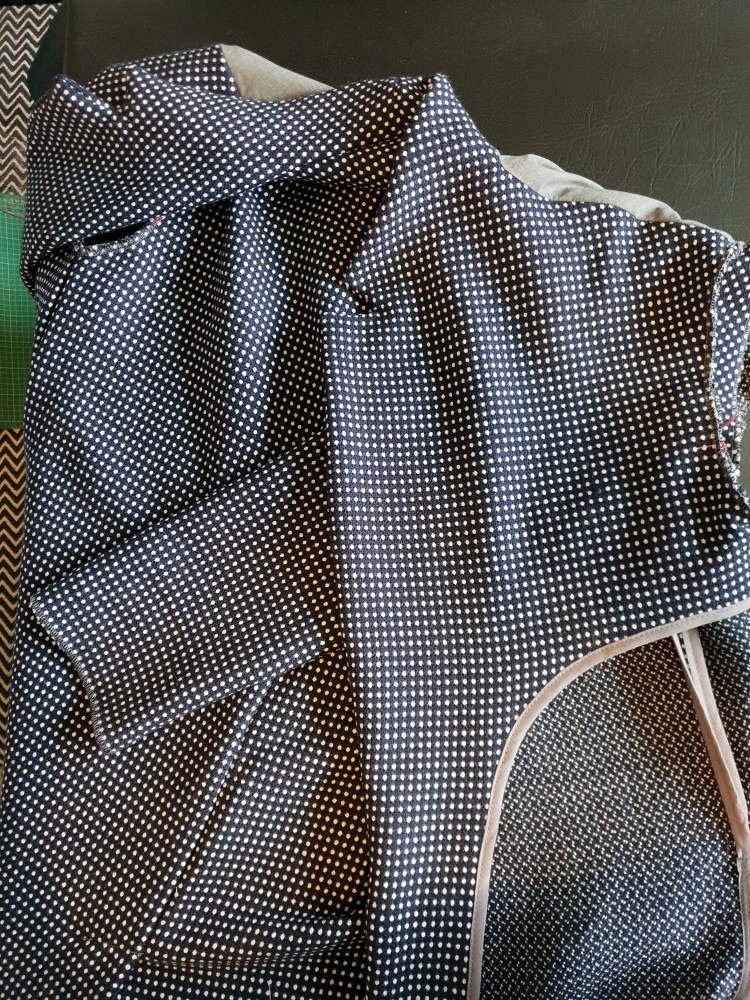 Turn the sleeve to the right side and feed the sleeve through the arm hole, matching the front and coat notches. The right side of the sleeve will face the right side of the armhole on the main coat.