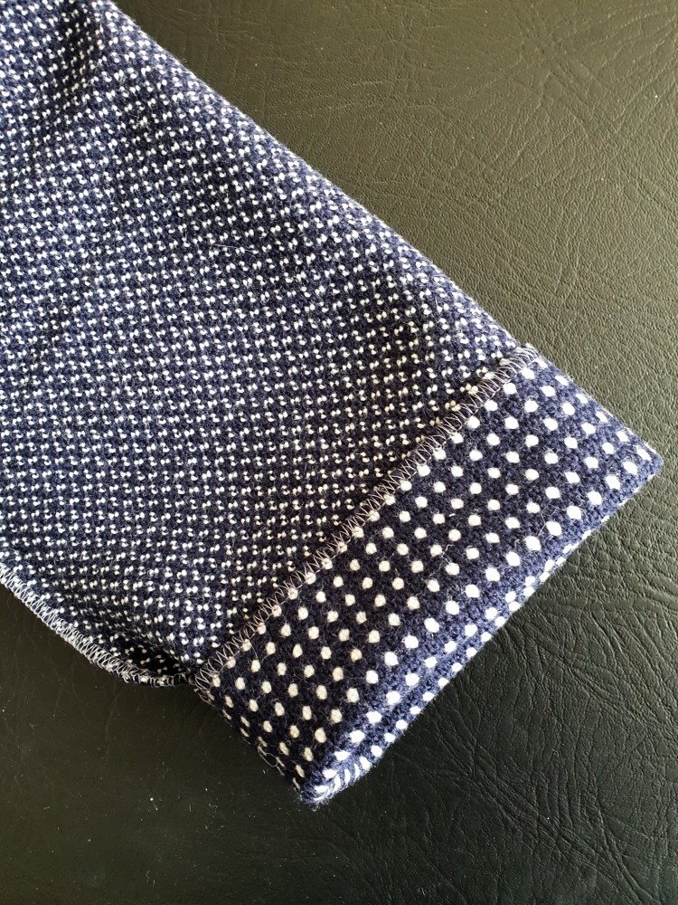 On the wrong side of the sleeve, turn over the hem allowance and sew in place. With smaller sizes, it may be difficult to sew this on your sewing machine, in which case hand stitching would be ideal.