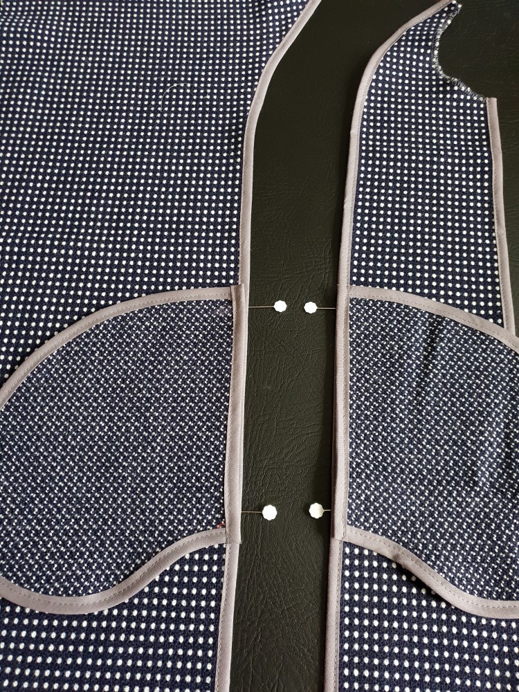 With the right sides of the front panels facing you, line up the pockets using the notches. Sew the pockets to the garment using a 1cm seam allowance. You may need to increase the seam allowance to allow you to sew past the binding.