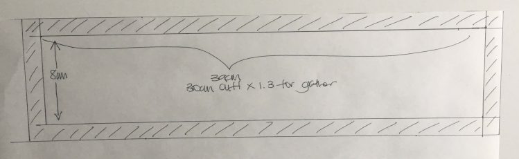 Step 5 – you can now start to pull gently on each side of the long threads BUT it’s important to note that you only want to gather so that the piece finishes your finished cuff width.