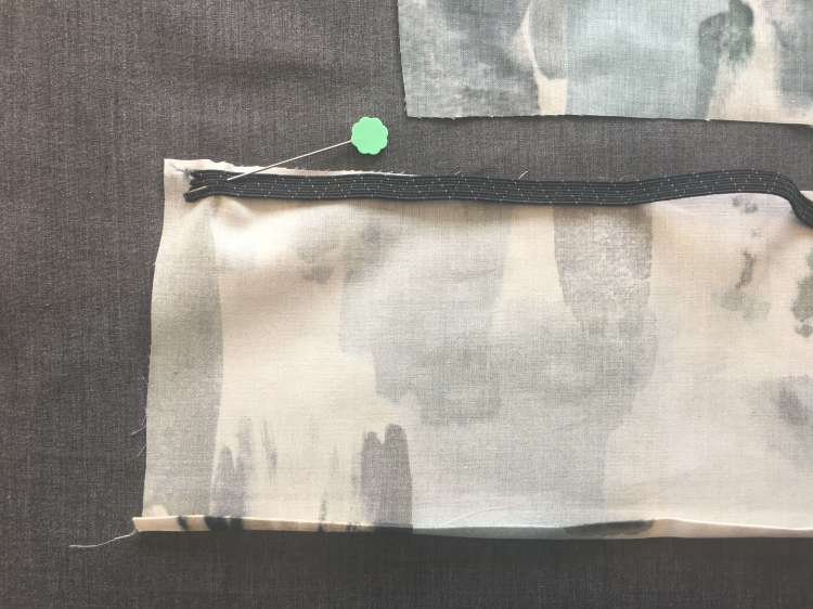 Step 6 – place the elastic along the top edge of the cuff (still working on the wrong side of the fabric), starting the elastic 1cm from the edge of the side. Place a pin to hold the elastic in place.