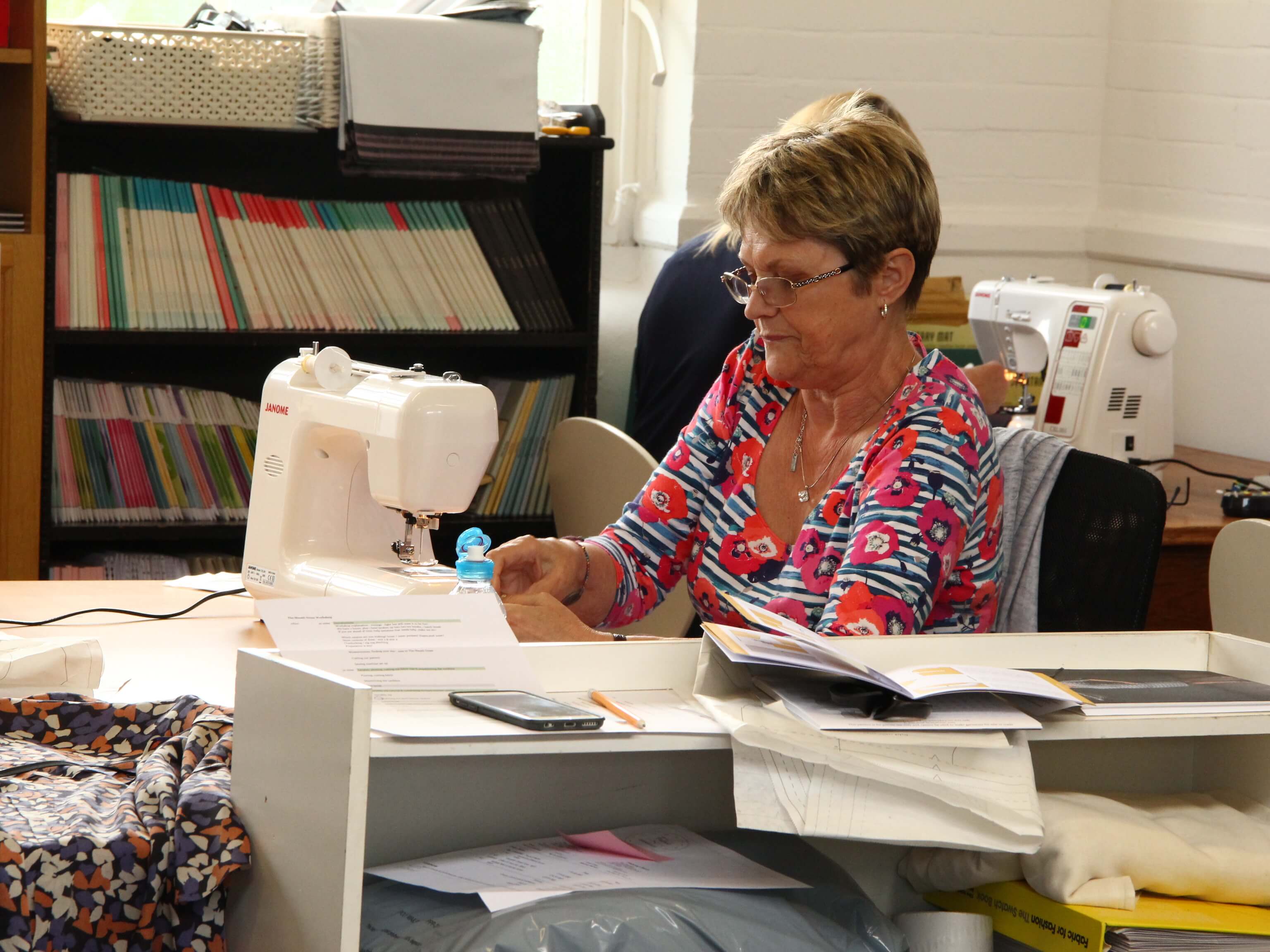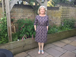 Lynette, wearing one of her handmade dresses, tackling a stretch fabric!